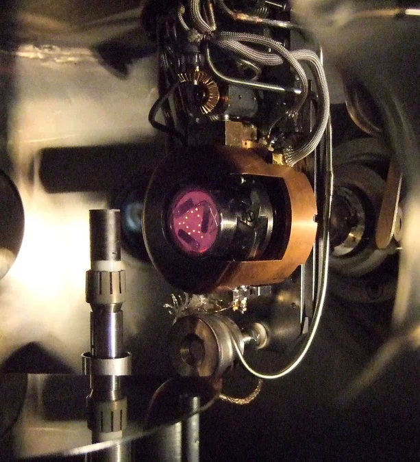 Pulsed Laser deposition is a very suitable technique compared to other deposition methods for the controlled deposition of complex multielemental thin films with a desired stoichiometry. For PLD a high power laser is used as an external energy source that interacts with a target and vaporizes this material. The evaporated material forms a plasma plume and is deposited on a heated substrate. The deposited material can range from nano-particles to thin films (amorphous - polycrystalline - single crystalline) that can contain stress, which may vary the film properties. How such an ablation process looks like is shown in the following image and video in one of our PLD chambers. Here, the ionic conductor YSZ is ablated using a 193nm excimer laser onto a heater. Normally, the sintered ceramic (cylindrical target) shows a white colour. Due to the intens interaction with the UV laser light, oxygen is removed and YSZ turns black. This is called incubation and common for quite a number of other ceramics such as SrTiO3 or MgO during ablation.