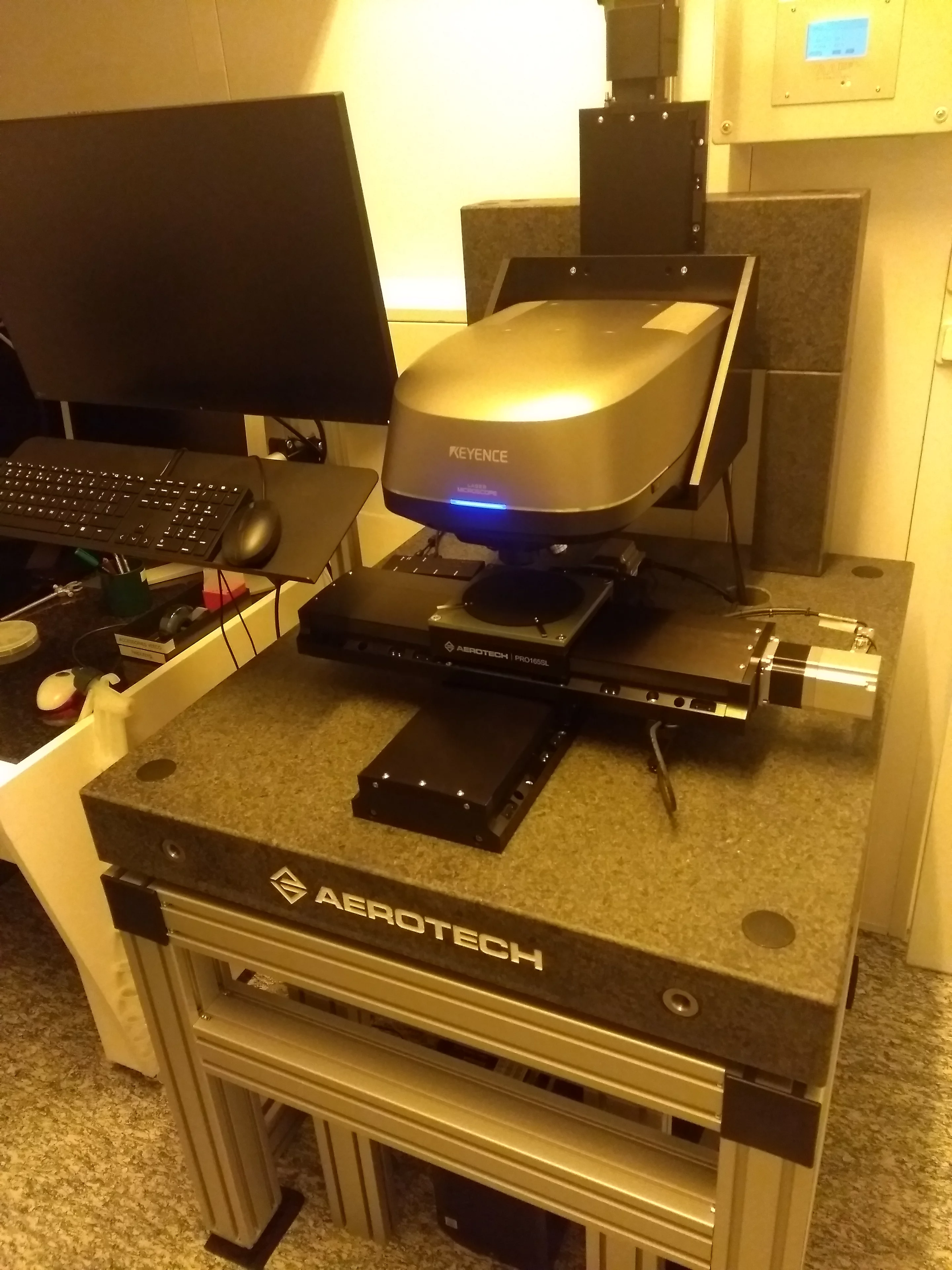 Keyence VK-X3100 is a non-contact 3D surface profiler. It enables capturing images and performing the profile, roughness and film thickness analysis. The measurement head is equipped with semiconductor laser with the wave length of 404 nm and white LED. To reach the best performance, it uses laser confocal scanning, focus variation, adn while light interferometry measurement methods. The motorized sample stage allows for automatic inspection of up to 200mm wafers.