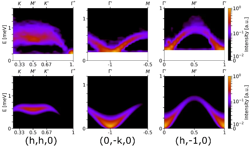 Figure 1: Magnetic excitations along high symmetry directions. False color plot of the observed (top) and calculated (bottom) inelastic neutron