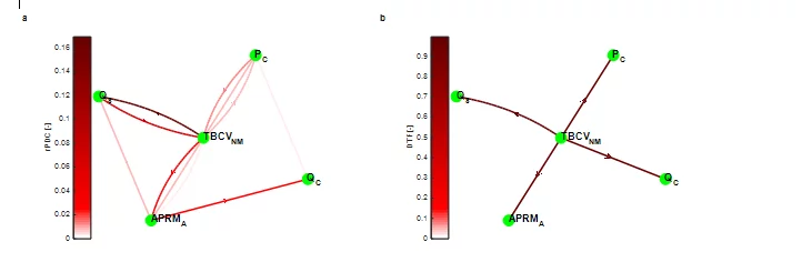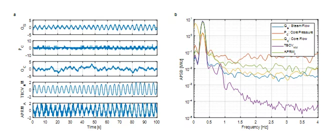 For this example, the MVAR model order is estimated by the Bayesian Information Criterion (p=6). Then a MVAR model based on the Nutall-Strand algoritm is fitted to the simulated data for estimating the model coefficients. The rPDC and DTF causality measures are estimated based on the trasnsformed MVAR model coefficients and their results are summarized in the network graphs, in Fig. 3. The TBCVNM signal clearly drives the response of both the steam flow and the neutron signal, based on the rPDC analysis. In addition, the bypass control valve fluctuation is evidently propagating throughout the entire system, based on the DTF analysis, indicating its essential impact during the synchronization of the generator. The key role of the TBCV can be explained by the fact that throughout the generator synchronization the turbine control valves (TCVs) are only partially open as the steam is dumped to the condenser. During the analyzed operation stage, the opening positions of the TBCVs are adjusted based on the steam dome pressure control system until the generator is synchronized and the steam is directed to the TCVs. Therefore, when the steam dome pressure exceeds certain limits then the TBCVs positions are opening and vice‐versa (this is why an interconnection is observed from PC to TBCV in Fig. 3a). Consequently, the TBCVs exhibit the oscillatory behavior, as depicted in Fig. 2a, and interfere with all the other reactor processes, as the connectivity networks indicate in Fig. 3.