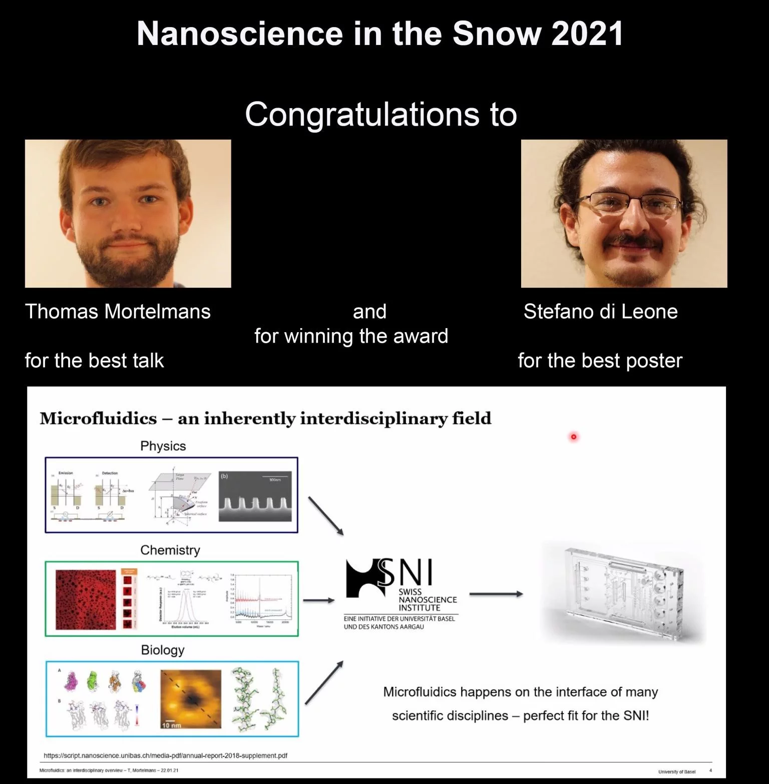 Every year, during the winter months, PhD students of the Swiss Nanoscience Institute take part in the SNI: Nano in the snow PhD school. Currently, as COVID-19 is still omnipresent in our everyday it happened virtually this year and Thomas Mortelmans took part. He said: “It was an exciting day filled with excellent scientific content from a variety of research fields; ranging from quantum physics, to protein engineering and drug delivery. During these events, the interdisciplinary of SNI is nicely highlighted and the benefit of joined research projects across scientific disciplines can be seen.”