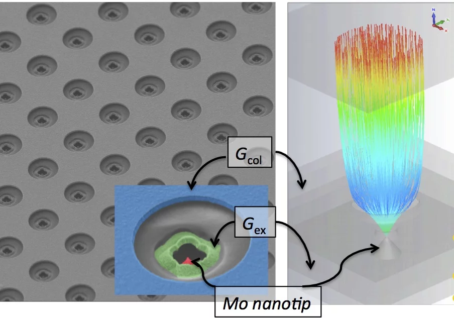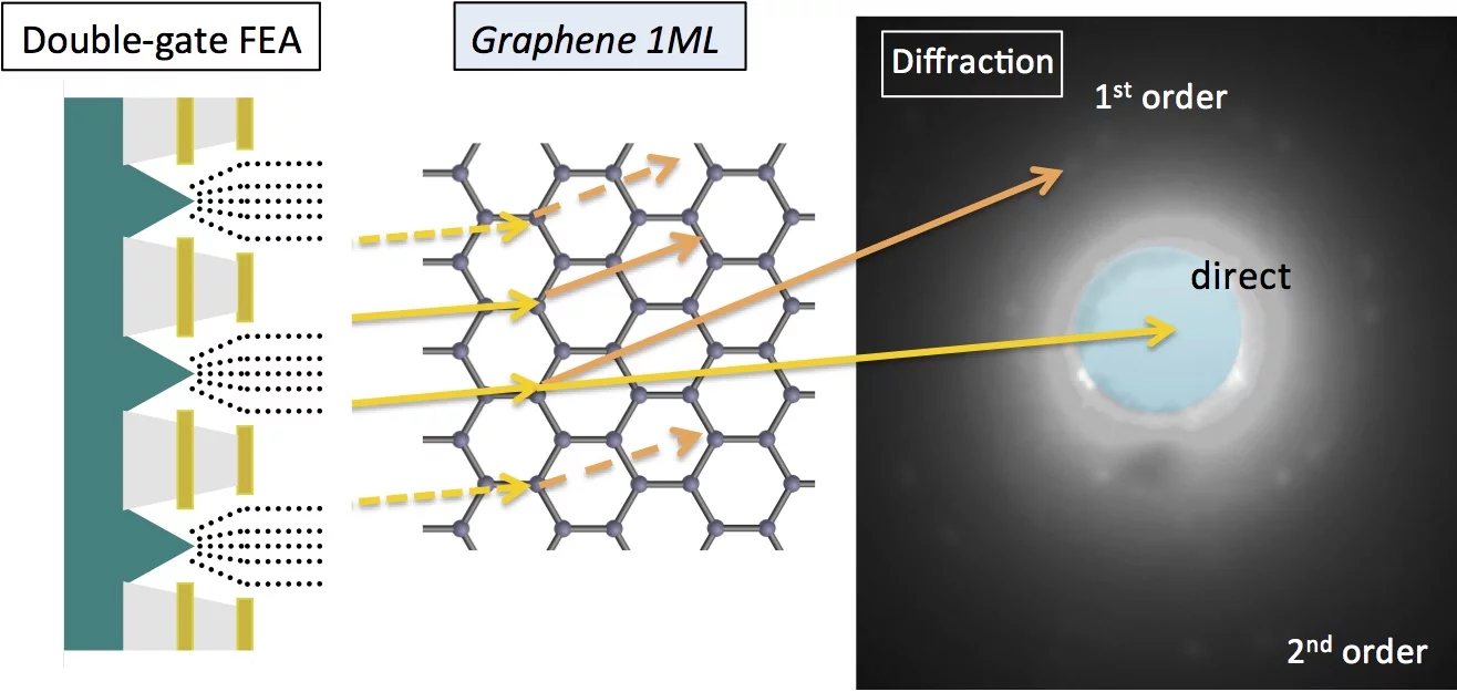 The possibility to realize a low-emittance nanofabricated FEA, producing collimated field emission beamlet from an array of metal nanotips with on-chip, integrated focusing electrode, has been intensely studied theoretically and experimentally in literature. The recent experiments by the Vacuum Nanoelectronics group in the Laboratory for Micro- and Nanotechnology in collaboration with the Max-Planck Institute demonstrated this for the first time by fabricating such a device with an optimized device structure, Figure 1, and performing the beam characterization experiments. In addition, the nanofabricated FEA was successfully applied to observe the electron diffraction from suspended graphene for the first time, Figure 2. The observations were well described by theory on the emittance and coherence of field emitters