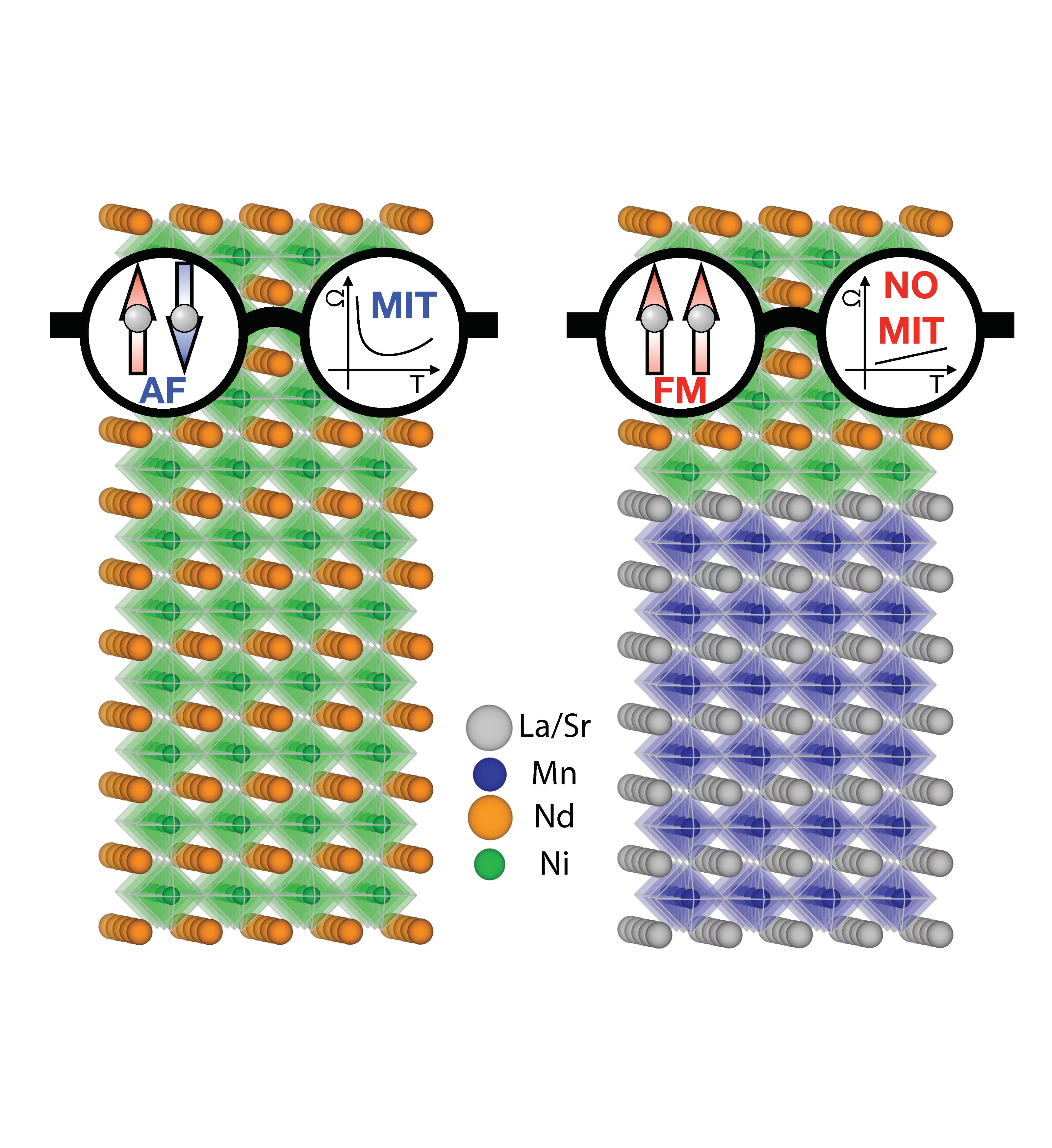 Employing X-ray magnetic circular dichroism (XMCD), angle-resolved photoemission spectroscopy (ARPES), and momentum-resolved density fluctuation (MRDF) theory, the magnetic and electronic properties of ultrathin NdNiO3 (NNO) film in proximity to ferromagnetic metal (FM) La0.67Sr0.33MnO3 (LSMO) layer were investigated. The experimental data reveal that the magnetic coupling between the nickelate film and the manganite layer causes an unusual, novel ferromagnetic (FM) phase in NNO. Moreover, ARPES data proves that the metal-insulator transition in the NNO layer is absent. The experimental data (XMCD and ARPES) with the momentum-resolved density fluctuation calculation (MRDF) directly links the MIT and the magnetic orders in NNO systems. This work demonstrates that proximity layer order can be broadly used to modify physical properties and enrich the phase diagram of RENiO3 (RE = rare-earth element).