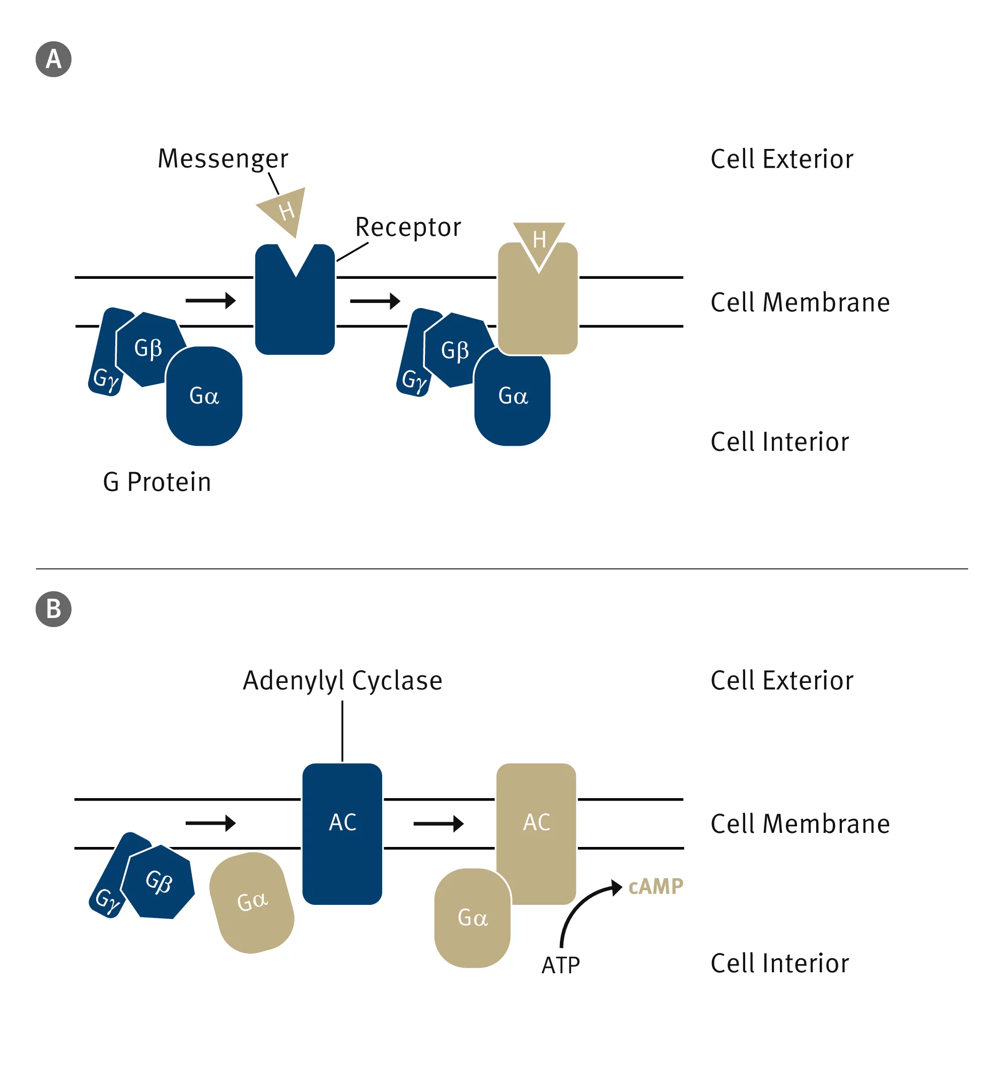 An important siganalling pathway in mammals consists of three components: The first is a receptor that recognises the signal and is activated by it. The second is a so-called G protein that binds to the activated receptor and transmits the signal to one or more effector proteins. In this case, the effector is adenylyl cyclase, the third component of the signal chain. This protein is activated by a subunit of the G protein and produces, in a biochemical reaction, a secondary messenger called cyclic AMP (cAMP).