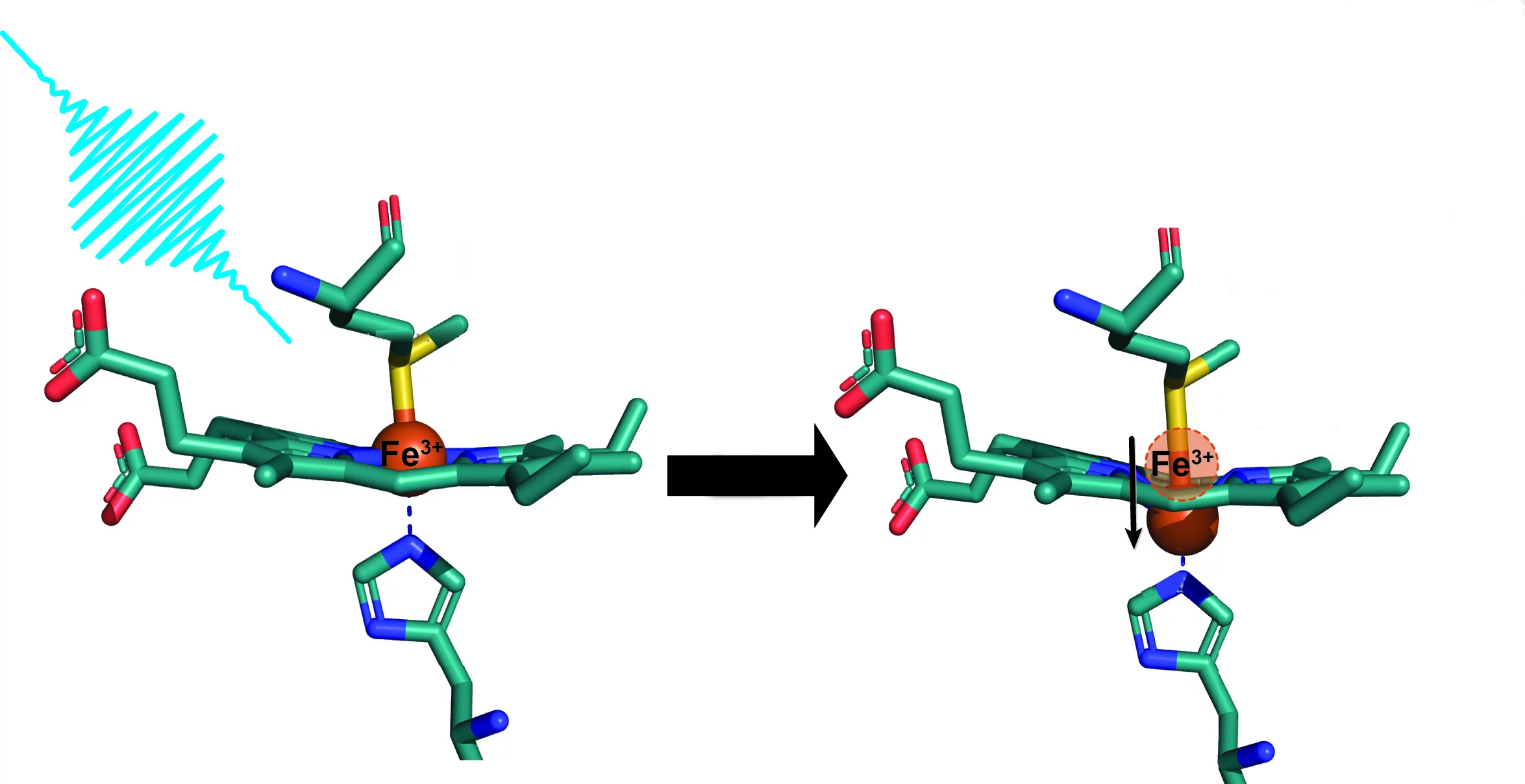 It was known that ferrous haem proteins with a doubly positive iron atom in the middle – such as haemoglobin and myoglobin – could "arch" under certain circumstances: The iron atom moves above or below the molecular plane in which it is situated. Scientists call this event "doming". This structural change takes place when the molecule is excited in any way, that is, when it is supplied with energy. In the laboratory, this can be achieved simply by irradiating it with a laser pulse.