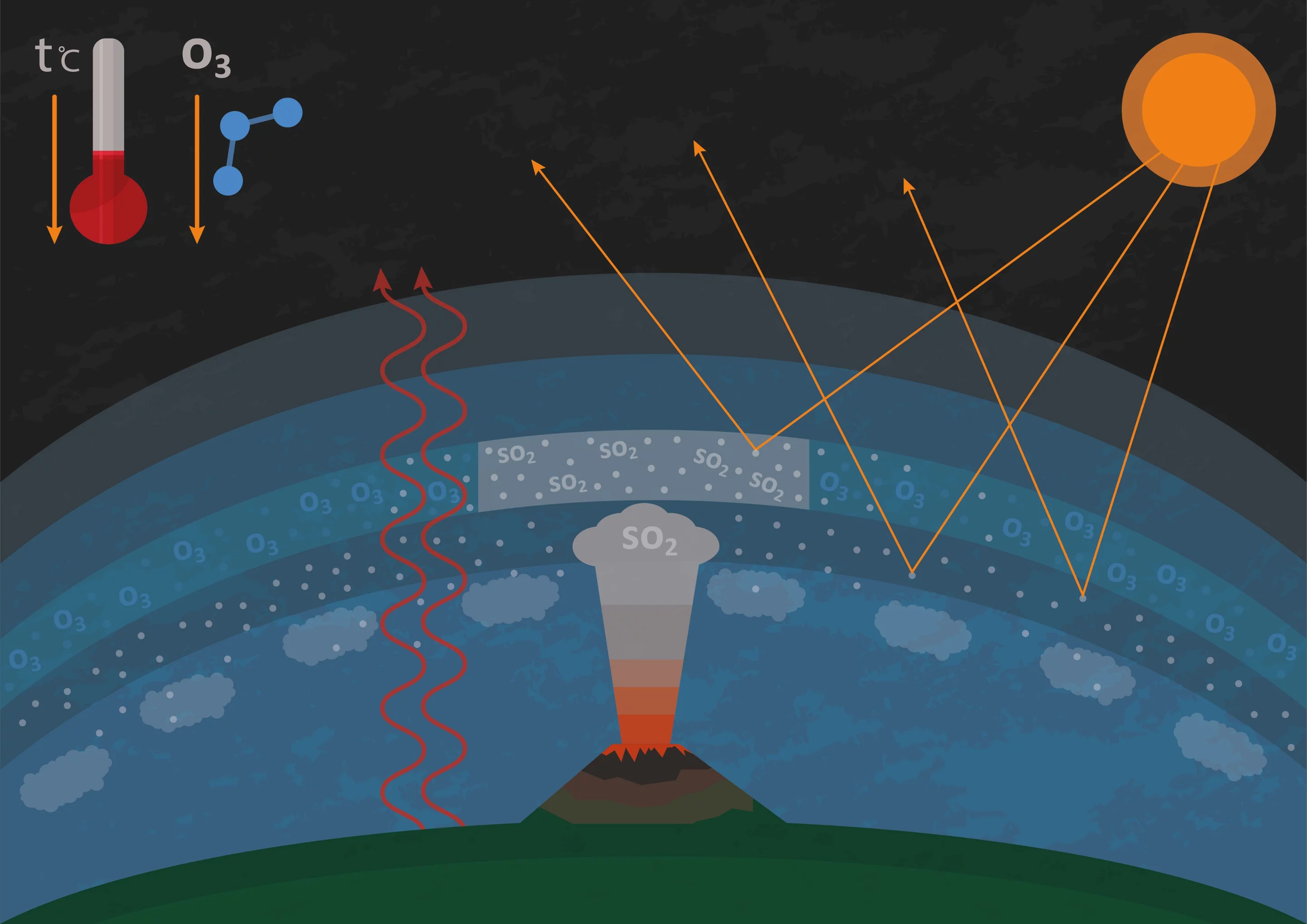 It is known that volcanic eruptions have a demonstrable cooling effect on the global temperature. Sulphur oxides that are thrown into the stratosphere by violent eruptions are responsible for this. Chemical reactions produce tiny droplets that scatter back some of the incoming solar radiation, thereby cooling the earth’s surface. The 1991 eruption of the Pinatubo volcano in the Philippines lowered the global temperature by 0.5 degrees in the following year. Five years later, it had already returned back to normal.
