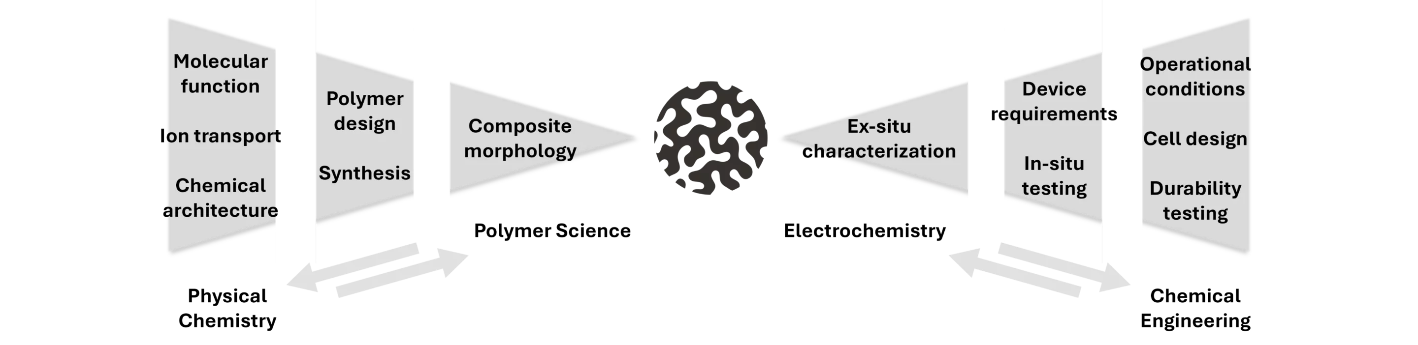 Below, I tried capturing how I approach my work within the analytical quests and materials design in the space of polymer electrolytes. It shows the breadth of topics and disciplines that are involved in central research questions I try to address, and what makes the topic so interesting.
