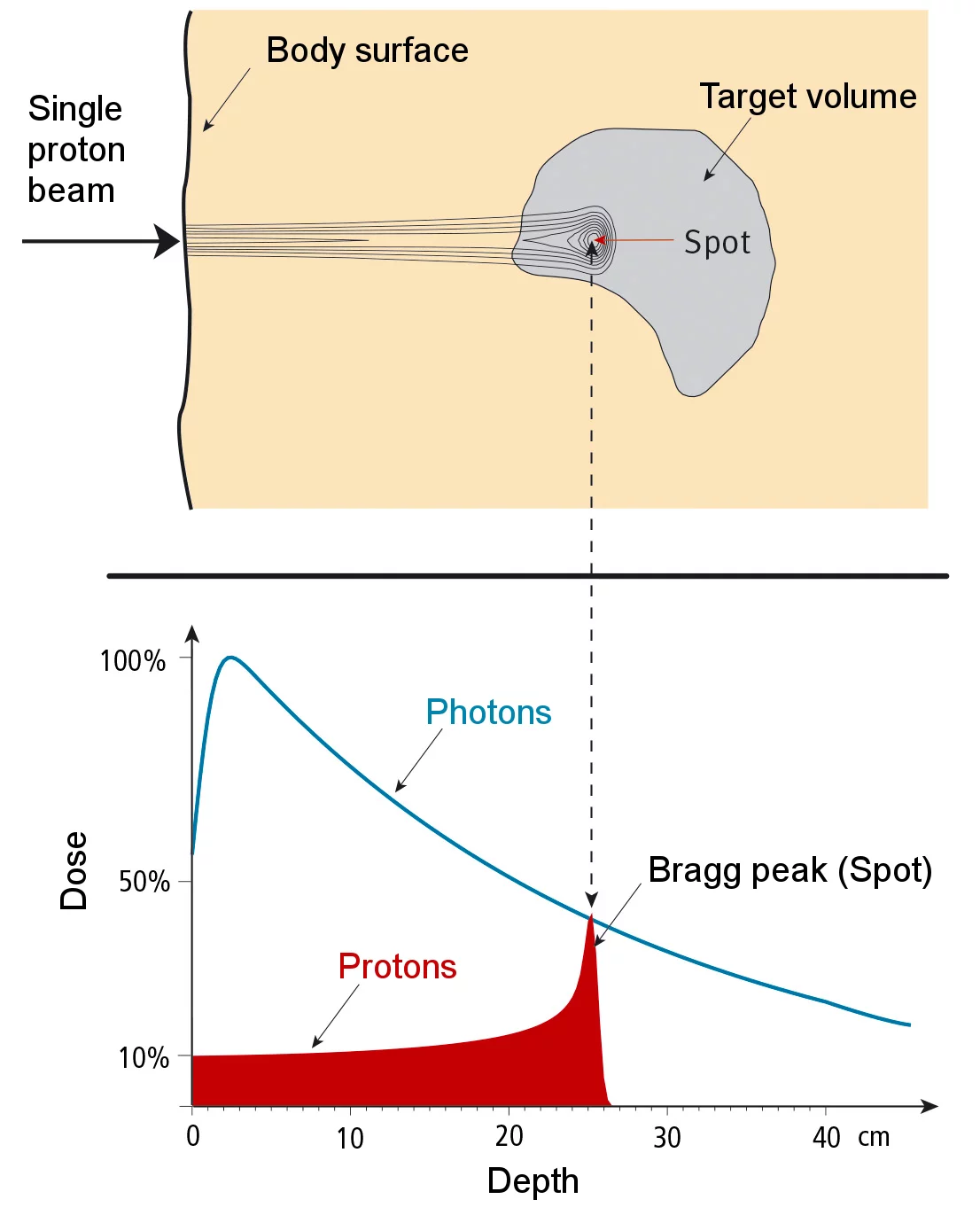 Radiation dose delivered by a pencil-thin proton beam penetrates body tissue to a specific depth determined by beam energy at point of entry.