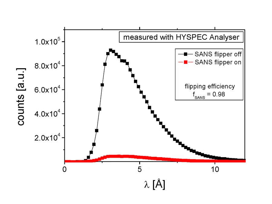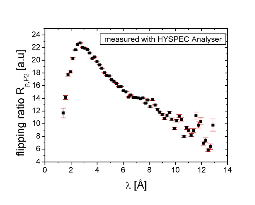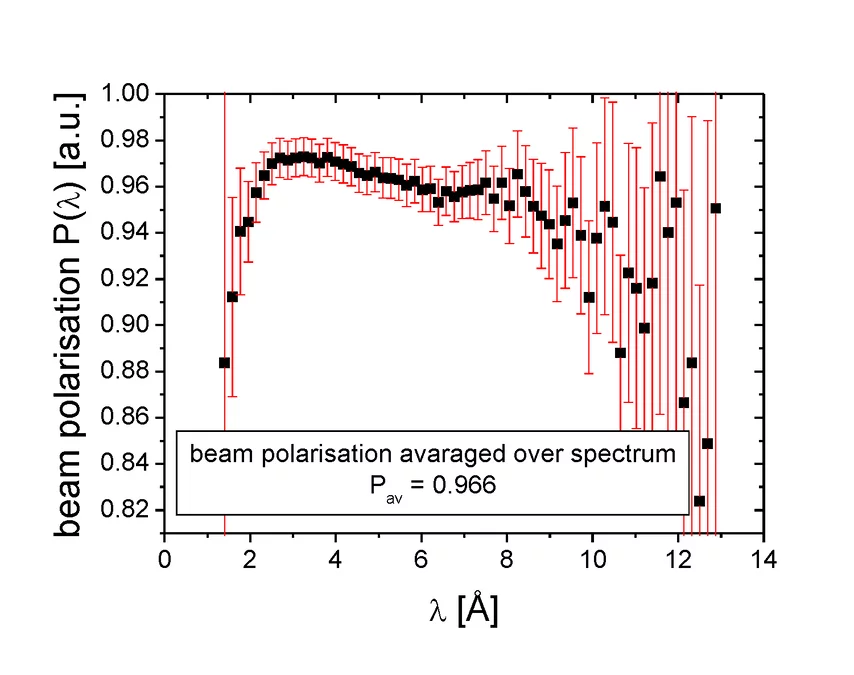 The set up for the polarized measurements is shown in the scheme above. The spectrum measurements with flipper on and off show that the beam is highly polarized. The flipping ratio has a maximum between 2 and 3 Angstrom. The beam polarization averaged over the whole spectrum has been determined to be 96.6 %
