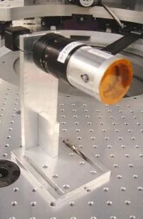 THIS SHOULD NEVER BE DISMOUNTED OR SHIFTED!! It is connected to a video screen in the control hutch, on which a blue dot has been drawn. This is the reference anchor point for aligning the focussed beam using the roll motor of the second DCM crystal and the pitch (downstream) motor of Mirror II. The field of view is approximately 6 x 4.5 mm. The second XRE is portable and mounted on a bracket mount (right image, below). This can be fixed as near as possible to the sample on the diffractometer to optimize the focussing (vertical: Mirror II bender; horizontal: Sagittal bender of second DCM crystal).