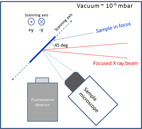 Figure 3. Top view of the measurement setup with the sample positioned in the 45 deg. geometry and in the focal planes of X-rays and on-line microscope.