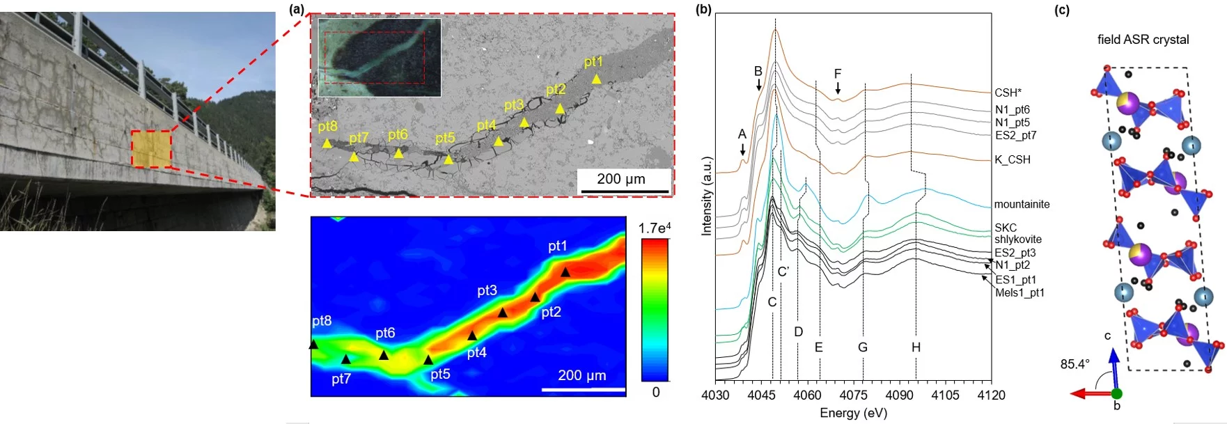 Here we explored the crystallinity and structure of the ASR product in the veins of an in situ altered aggregate grain of an ASR-affected bridge with micro-scale resolution. X-ray absorption micro-spectroscopy at the PHOENIX beamline of the Swiss Light Source (SLS) provided insight into the crystallinity and structure of ASR products. Concrete samples with ASR damage demonstrate a universal micro-morphology of reaction product veins running from inside the aggregate to the cementitious paste, as shown by the SEM image (Fig. 1a). The product inside the aggregate is often crystalline with nano-platy morphology, while the product in the cementitious paste is often amorphous. Ca, K and Na K-edge XANES spectra were collected at spots within both crystalline and amorphous regions of the product vein (Fig. 1b), according to the florescence map of the microstructure. Examples of Ca K-edge XANES are displayed. They were compared with reference phases. The results indicate that the crystalline ASR products exhibit an identical chemical environment, despite their distinct sources and exposure conditions. Similarly, the amorphous ASR products from different field specimens are also identical. Furthermore, the crystalline ASR products resemble the structure of shlykovite, which is a layer silicate with Ca layers between silicate sheets and K/Na imbedded within the sheets (Fig. 1c). The amorphous ASR products highly resemble the structure of C-S-H (calcium silicate hydrate) phases, although they seem to have different nano-morphology. For the first time we confirm the molecular configuration of the ASR products, and establish a linkage between them and the lab-synthesized ASR samples. This improved understanding of the ASR structure and crystallinity is essential for studying the thermodynamic and kinetic aspects of the ASR product formation under various boundary conditions. It paves the way to mitigation and management of affected structures and to develop repair strategies.