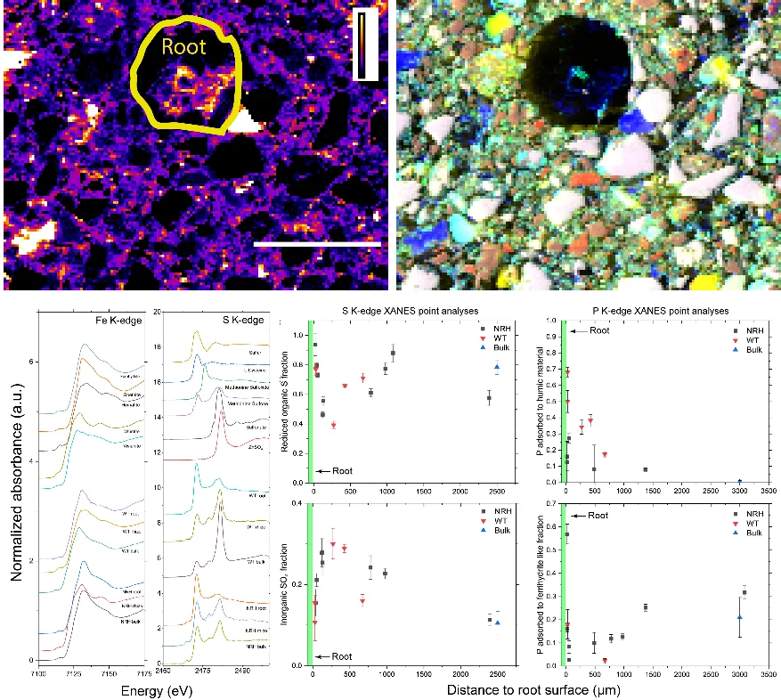 Soil resources are usually inaccessible to plants, because of the tightly bound nature of nutrients to soil minerals and organic matter. Roots can overcome this by engineering their direct environment, the rhizosphere. Roots significantly augment rhizosphere soil structure that is beneficial, such as bulk density and porosity. However, the chemical alterations have not been extensively investigated in situ. This study combines structural information, previously obtained with synchrotron X‐ray computed tomography (XCT), with XRF microscopy and XANES spectroscopy to unravel chemical changes induced by plant roots. Our results suggest that iron (Fe) and sulfur (S) increase notably in the direct vicinity of the root via solubilization and microbial activity. XANES further shows that Fe is slightly reduced, S is increasingly transformed into sulfate (SO42−) and phosphorus (P) is increasingly adsorbed to humic substances in this enrichment zone. Moreover, the ferrihydrite fraction decreases drastically, suggesting the preferential dissolution and the formation of more stable Fe oxides. Additionally, the increased transformation of organic S to sulfate indicates that the microbial activity in this zone is increased. These changes in soil chemistry correspond to the soil compaction zone as previously measured via XCT. The fact that these changes are co-located near the root and the compaction zone suggests that decreased permeability as a result of soil structural changes acts as a barrier creating a zone with increased rhizosphere chemical interactions via surface‐mediated processes, microbial activity and acidification. The measurements have been taken at the PHOENIX beamline of the Swiss Light source and beamline I18 of the Diamond Light Source.
