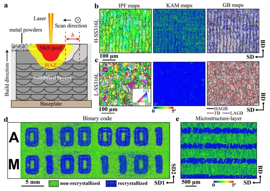 Here we show how to engineer the microstructure of stainless steel during AM without relying on mechanical deformation. Using laser powder bed fusion (LPBF) technology, we devise processing strategies to “program” the thermal stability of the as-solidified alloy and decide, a priori, how the material’s microstructure will change upon heat treatment (HT). These strategies restore some of the microstructure control capabilities offered by conventional metal processing. More interestingly, they allow creating new materials that integrate dissimilar microstructures by programming the alloy’s thermal stability site-specifically. Site-specific microstructure control of metals is one of the most unique and attractive capabilities of AM.