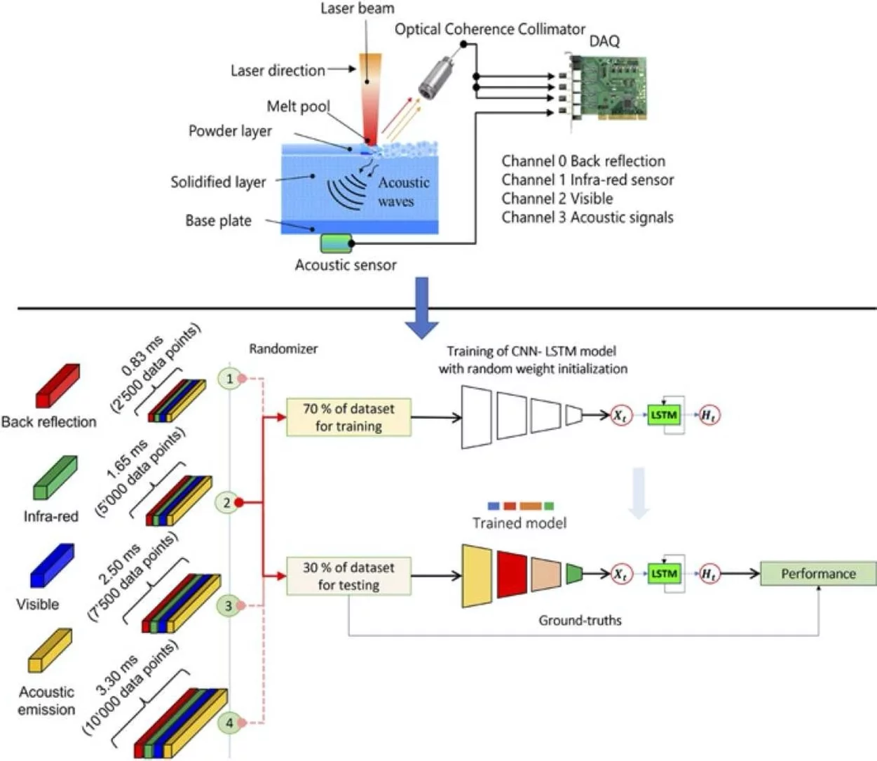 A novel monitoring strategy for laser powder bed fusion processes based on a hybrid deep learning model is presented. It combines convolutional neural networks with long-short term memory. This model allows the classification of printing regimes with an accuracy of 98% across variable time-scales.