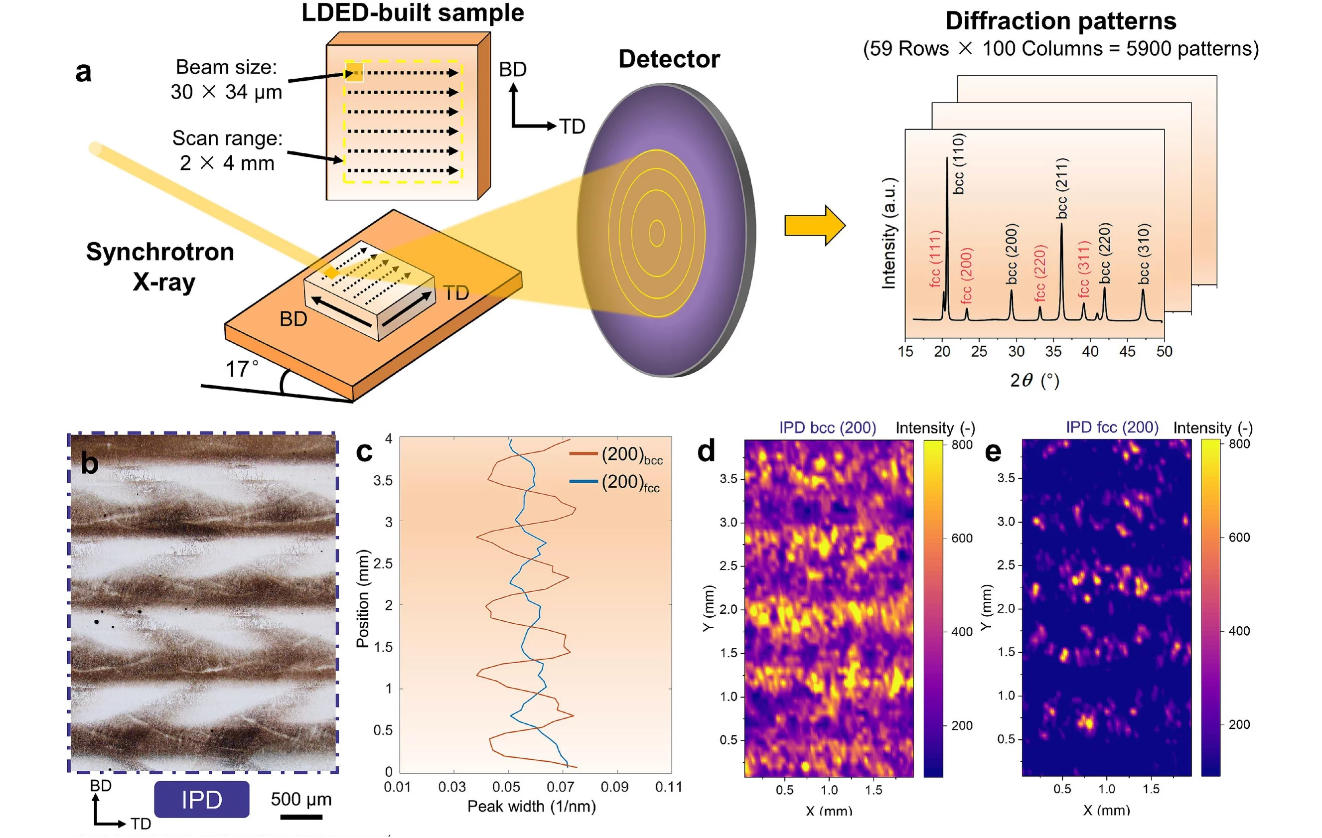 To better understand how the alloy’s internal structure evolves during printing, researchers at PSI performed high-resolution X-ray microdiffraction measurements at the MicroXAS beamline of the Swiss Light Source. Using focused synchrotron radiation, they mapped the local crystal phases and determined the dislocation density at various points within the printed material. This analysis revealed how the microstructure varied across different processing conditions and helped explain the alloy’s mechanical performance. The X-ray data provided crucial experimental validation for the design framework and offered new insights into the microscopic mechanisms that govern strength and durability in additively manufactured metals.