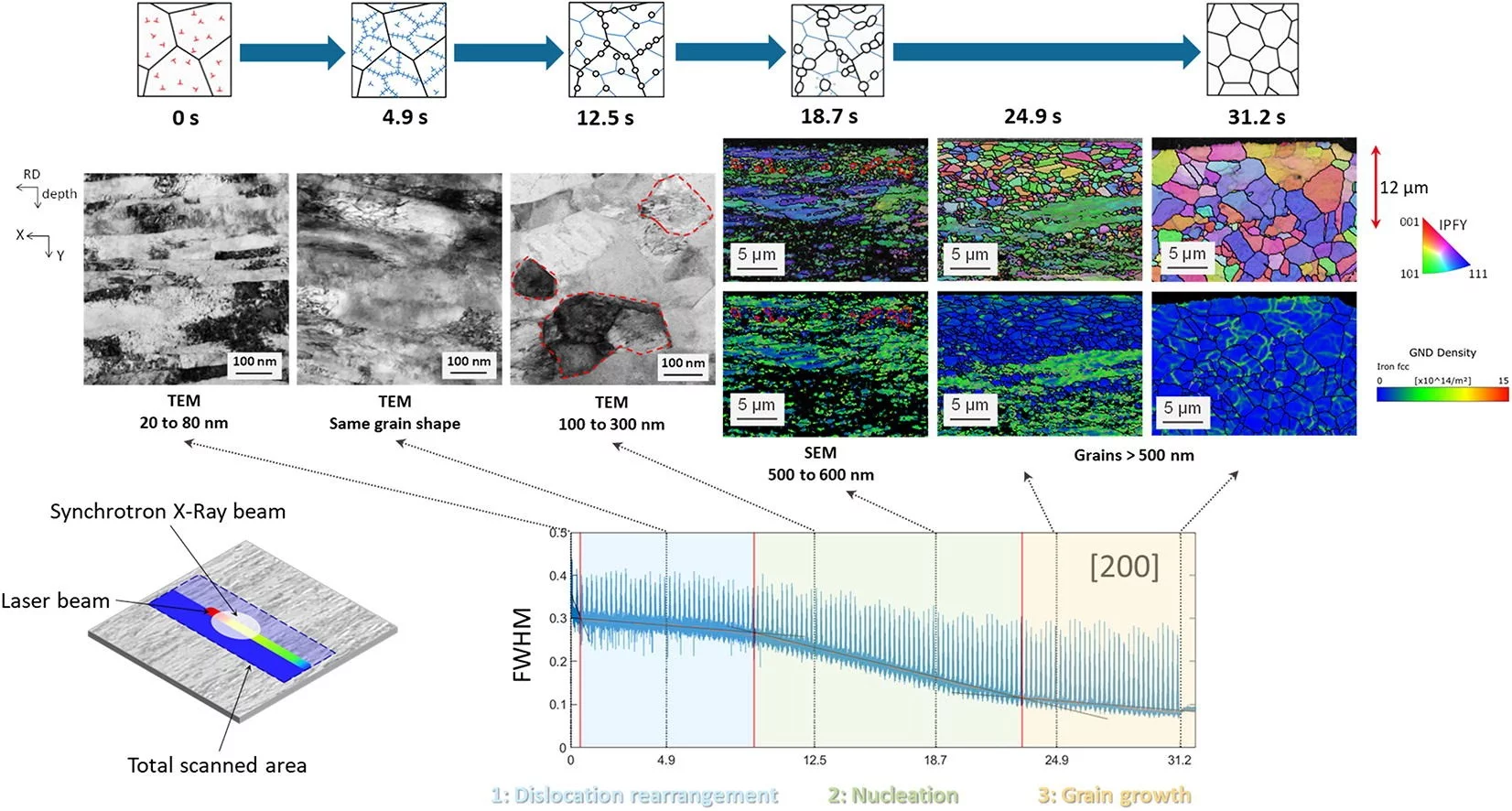 Grain refinement of metal structures is an extensively used method for improving mechanical properties of multiple alloys (and steels in particular), since most of the parts generated from casting or laser-based additive manufacturing (LAM) result in coarse grain structures or highly textured columnar grains. Different strategies can provide more random textures with lower defect content and finer, more homogenous grain size distribution. For instance, annealing will trigger the rearrangement of dislocations in a deformed material, and may promote nucleation of recrystallization. At high-angle grain boundaries, dislocation-free crystallites will form and grow to replace the initial microstructure. In this regard, a precise microstructural control becomes essential for ensuring good quality of a metallic part. Yet, the capacity to successfully refine the microstructure is highly dependent on the specimen's initial state. For example, LAM 316L samples exhibit slower kinetics and a higher recrystallization temperature than conventionally produced 316L.