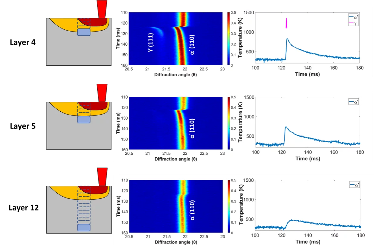 Researchers from the Paul Scherrer Institute (PSI) and Chalmers University of Technology have combined advanced in situ experiments and simulations to untangle this complexity. Using a miniaturized LPBF setup at the Materials Science (MS) beamline of the Swiss Light Source, they performed real-time synchrotron X-ray diffraction measurements on a Fe–0.45C hypo-eutectoid steel. The high brilliance and time resolution of the beamline allowed diffraction patterns to be recorded at rates up to 20,000 frames per second, revealing how the crystal structure changed during melting, solidification, and the brief reheating of previous layers.