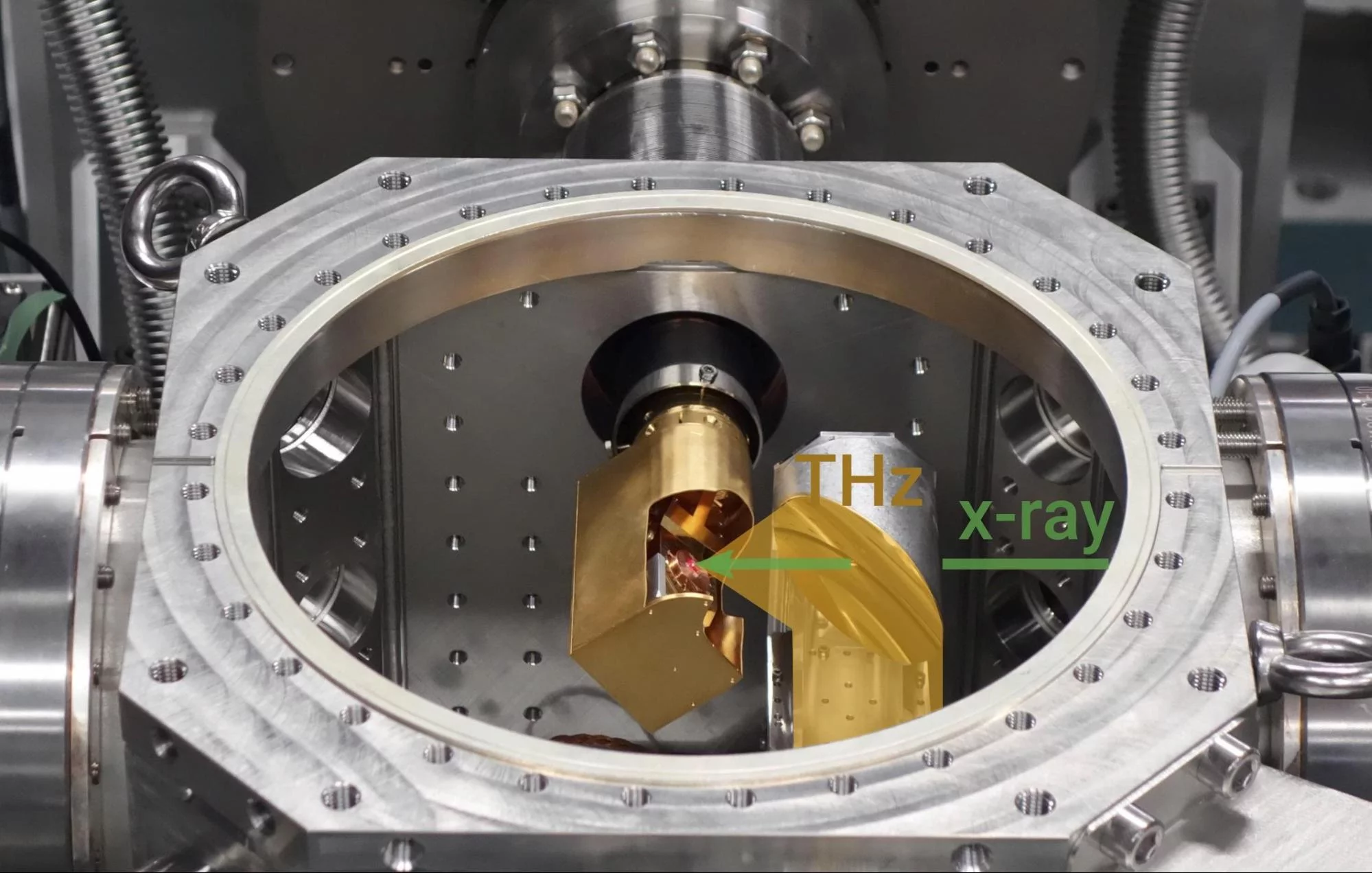 The combination of such a high field with a low sample temperature was made possible by a dedicated vacuum chamber specially designed for this class of experiments at the Bernina instrument. Here, the THz field is strongly focused with an in-vacuum parabola, and the sample is cooled with a He flow cryostat and highly covered by heat shields. The X-ray pulses provided by SwissFEL are guided through a 1.5mm hole in the parabola on the sample collinear with the THz pulses to maintain optimum temporal resolution and also to permit THz polarisation studies. This setup has been commissioned since the beginning of 2020 and is now at Bernina available to the user community.