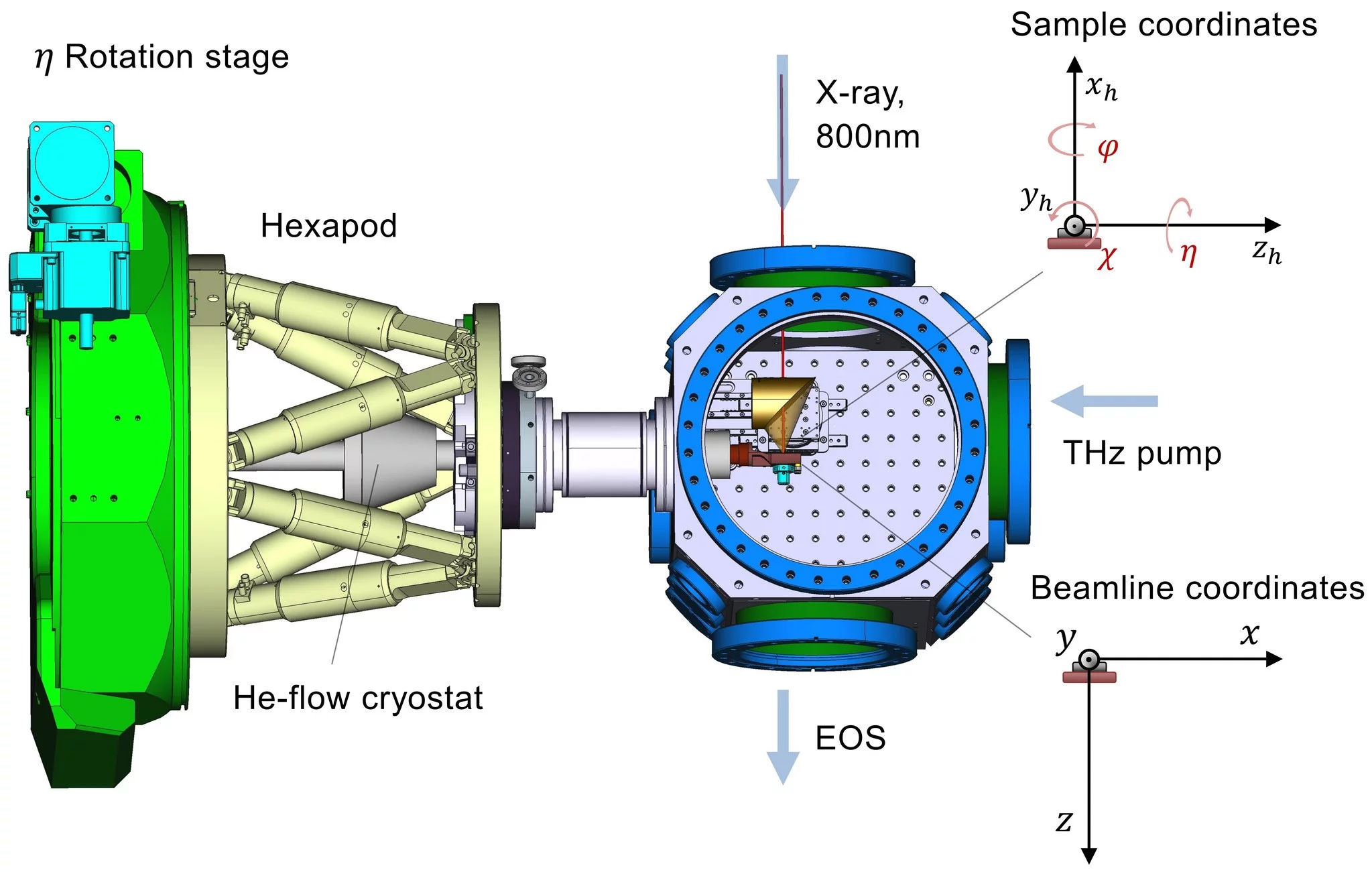 The figure above shows the experimental geometry and the sample chamber as seen from top. The sample is mounted on the cold finger of a helium flow cryostat, which is motorized outside vacuum by a 6 degree of freedom hexapod (coordinate system xh, yh, zh), mounted to a large rotation stage used for the main sample rotation η around the zh-axis. All sample orientation and diffraction angles are defined according to a frequently used convention (You, H 1999 J. Appl. Crystallogr. 32 614–23 https://doi.org/10.1107/S0021889899001223 [71]), except for ν, which was replaced with γ to prevent mix-ups during the beamline control due to similarities between the detector and sample motions ν (nu) and μ (mu).