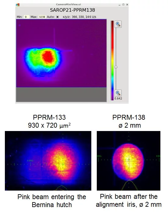 The upper picture shows the pink beam on the last diagnostic screen of the beamline.