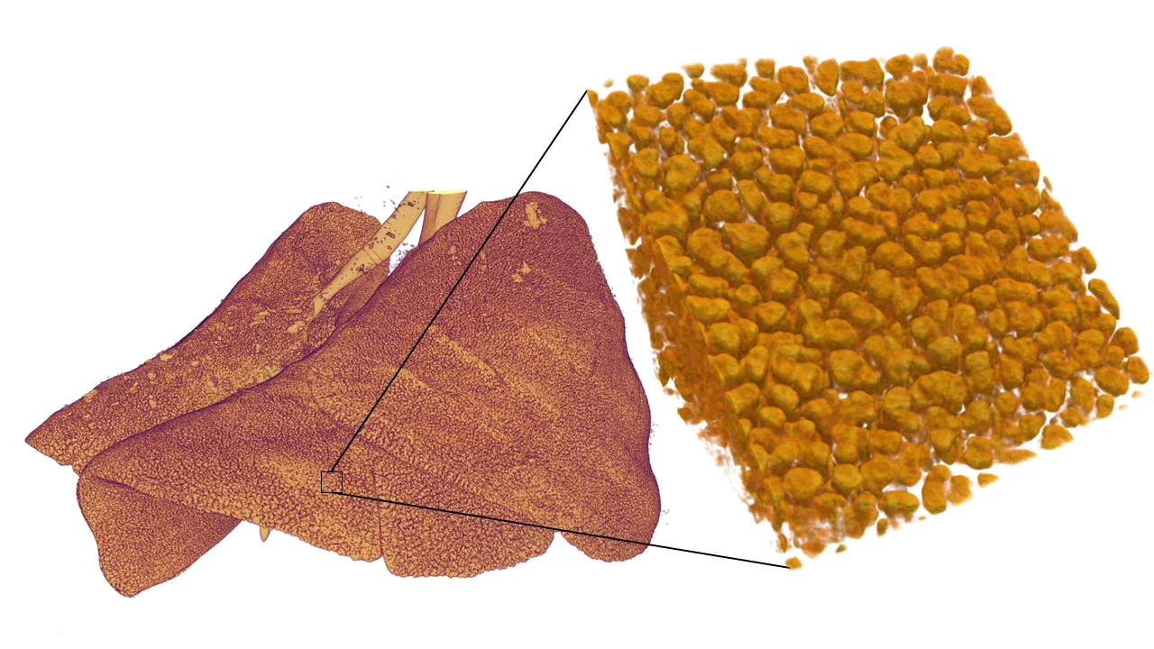 With respiratory diseases being amongst the leading causes of morbidity and mortality affecting more than 450 million people worldwide [1], X-ray computed tomography (CT) remains the gold-standard technique for detection, diagnosis, and follow-up in lung diseases. However, due to the ionizing character of X-rays, the tolerable radiation dose currently imposes the ultimate limit to the accessible resolution. In this collaborative project, we aim at improving the spatial resolution of (pre-clinical) thoracic X-ray CT beyond the physical resolution limit by using prior knowledge about the branching and microstructure of the lung learned from experimental animal models.