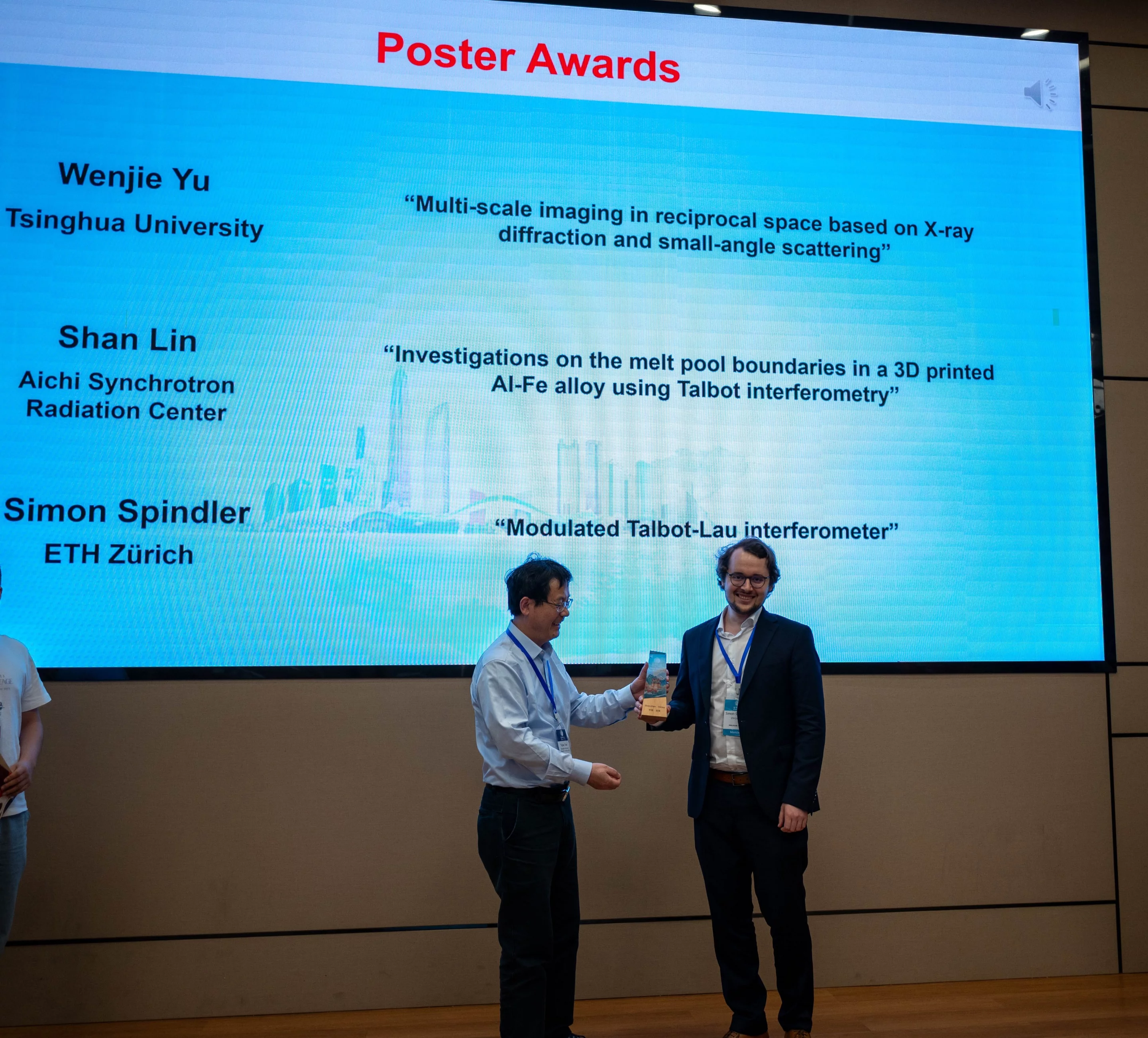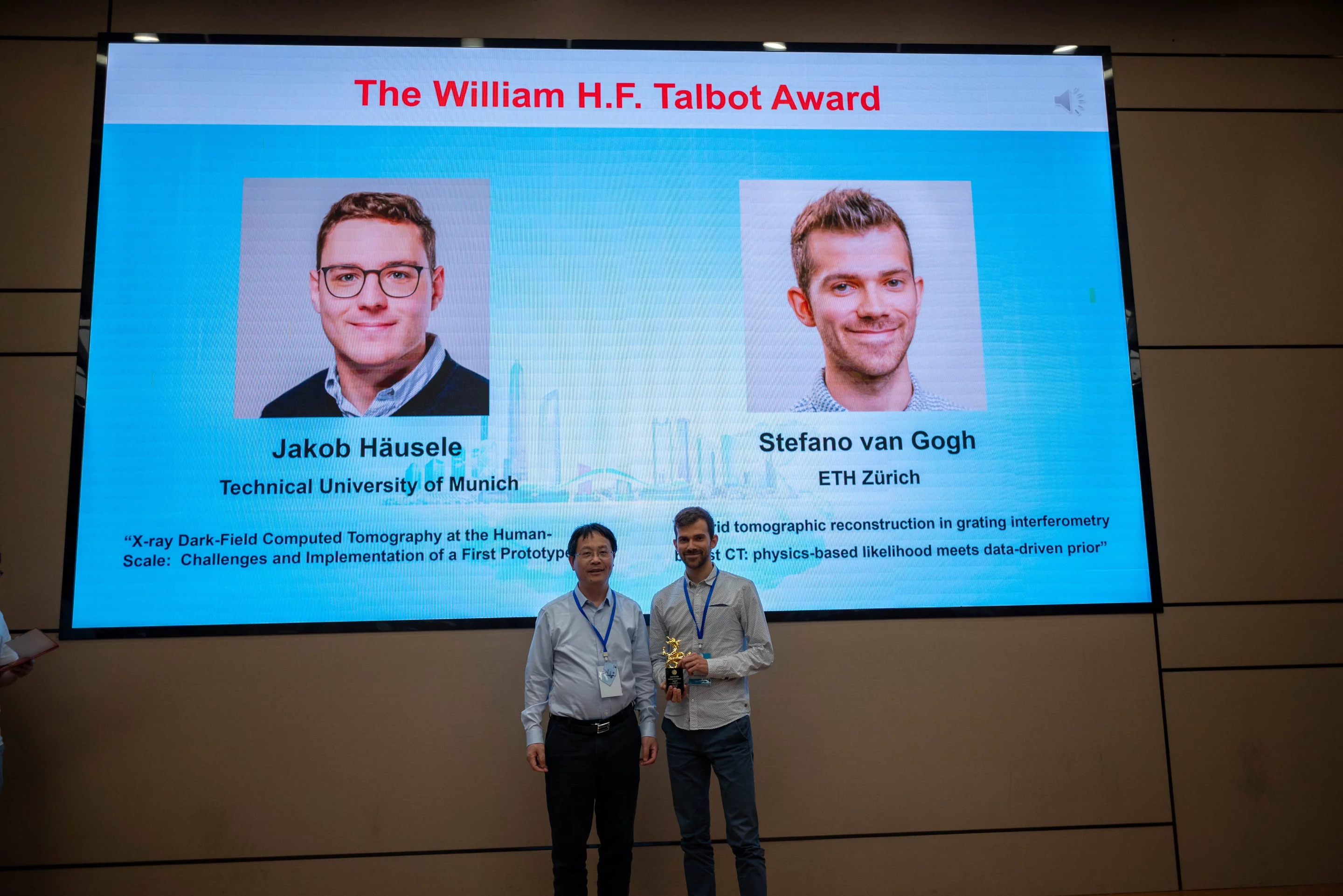 A TOMCAT delegation attended the 6th International Conference on X-ray and Neutron Phase Imaging with Gratings (XNPIG2024) held on 8-12 April, 2024 in Shenzhen, China. The team delivered a series of two invited talks and seven contributed talks, all of which were well-received by the conference attendees. Two team members were selected for their outstanding contributions: Simon Spindler was awarded one of the Best Poster Prizes for his recent work on “Diffraction Beamlets” while Stefano van Gogh was the co-recipient of the W.H.F. Talbot Award, in recognition of his outstanding PhD thesis entitled "Hybrid tomographic reconstruction in grating interferometry breast CT: combining physics-based likelihoods with data-driven priors".