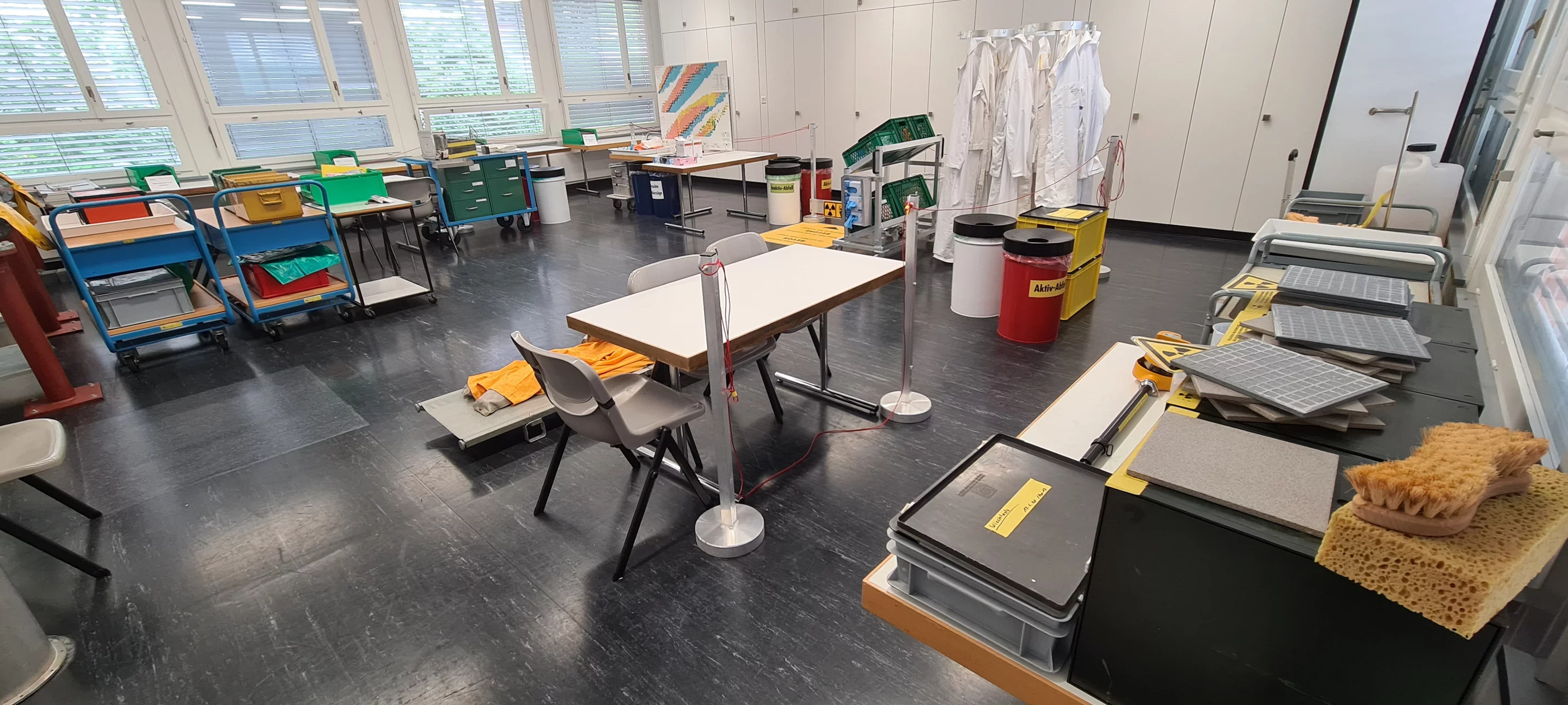 Für das Arbeiten mit offenen radioaktiven Quellen (z.B Tc-99m) steht ein C-Labor mit Kapellen und weiteren Arbeitsplätzen für 16 Personen zur Verfügung. Zum Experimentieren mit geschlossenen radioaktiven Quellen zu Themen wie Zerfallsarten, Abschirmung und Gammaspektroskopie sind 16 Arbeitsplätze vorhanden.