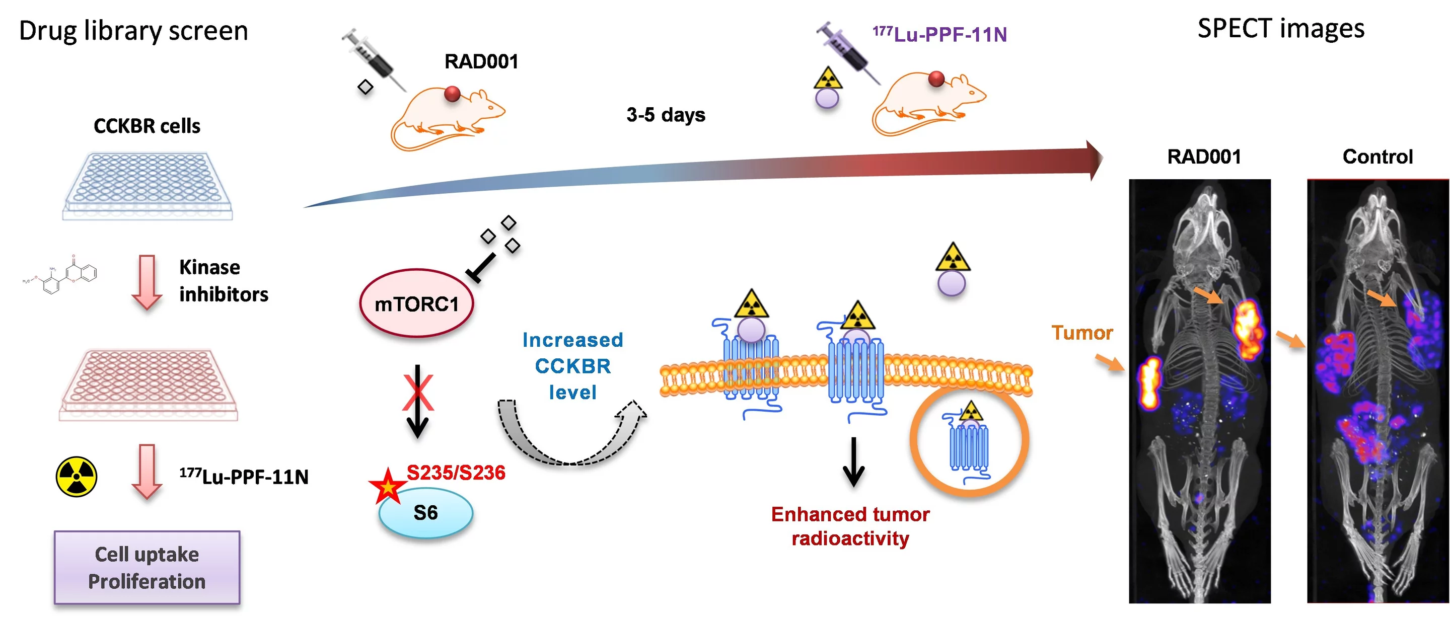 Drug library screen for identification of efficacious combinatory treatments. Pharmacological inhibition of mTORC1 by everolimus (RAD001) increases CCKBR-specific tumor uptake of radiolabeled minigastrin analogue 177Lu-PP-F11N in preclinical MTC models. Adapted from Grzmil et al., 2020. Theranostics.