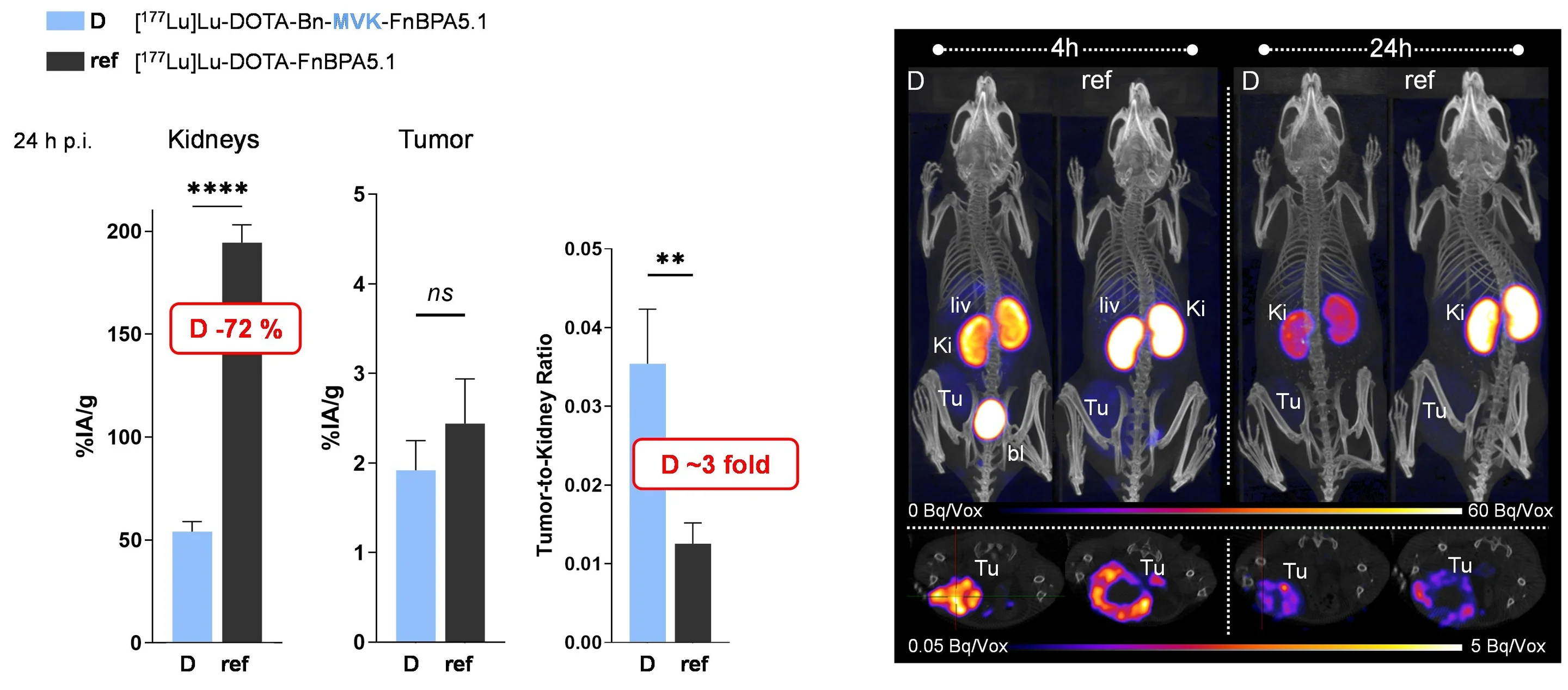 A major challenge in RLT is kidney clearance and reuptake, which can cause high renal accumulation and potential nephrotoxicity. Thus, various strategies have been developed to reduce kidney retention and improve the therapeutic efficacy of radioligands [de Roode et al., 2024. Pharmaceuticals]. Recently, we developed fibronectin-binding peptides (FnBPs) with dual MVK-based cleavable linkers. This dual-linker strategy significantly reduced renal retention and improved tumor-to-kidney ratios compared to derivatives featuring a single MVK unit [Valpreda et al., 2022. Bioorg Med Chem] (Fig. 2). Furthermore, we showed reduced kidney uptake of radiolabeled exendin-4 by using variants of the renally cleavable linker MVK in GLP-1R tumor-bearing mice [Trachsel et al., 2023. EJNMMI Radiopharm Chem]. This strategy is an important step towards the clinical translation and might as well be adopted for other radiopharmaceuticals suffering from persistent renal retention of radioactivity.