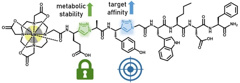 Derivatized minigastrin analogues are promising drugs for targeting the cholecystokinin B receptor (CCKBR), overexpressed in various neuroendocrine tumors, including medullary thyroid cancer (MTC). Our research showed that replacing the pentaglutamic acid sequence in minigastrin with a flexible aliphatic linker enhanced internalization, tumor uptake, and blood plasma stability [Ritler et al., 2019. Bioconjug Chem]. Computational modeling revealed ionic interactions between receptor cationic residues and anionic linker residues, highlighting the role of negative charges and supporting molecular modeling for improved minigastrin analogue design. In other study, we introduced amide-to-triazole substitutions in the minigastrin analogue MG11. This “triazole scan” produced peptidomimetics with significantly improved enzymatic stability and/or CCKBR affinity [Grob et al., 2020. J Med Chem (1)], opening new avenues for peptide drug development. Further enhancements with multiple triazole substitutions yielded conjugates with greater stability and receptor affinity (Fig. 1). Radiolabeled multi-triazolo-peptidomimetics showed up to 4-fold higher tumor uptake versus the all-amide reference compound [Grob et al., 2020. J Med Chem (2)]. Importantly, a linear peptidomimetic with three triazole insertions retained full biological activity.