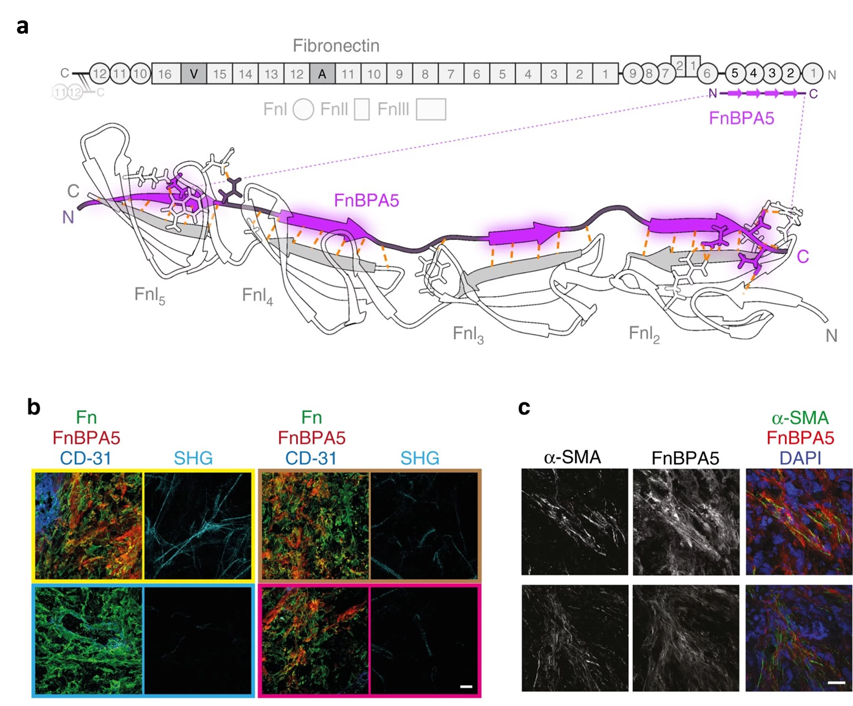 Novel peptide probes to assess the tensional state of fibronectin fibers in cancer. (a) Schematic representation of the multidomain protein fibronectin with epitope for FnBPA5 which binds to modules FnI2–5 via an antiparallel beta-zipper. (b) Stains of FnBPA5 (red), fibronectin (green), CD-31 (blue), and mature collagen fibers visualized by SHG (cyan) as well as the representative z-projection images (c) for α-SMA and FnBPA5 merged with nuclei staining (DAPI) in tumor cryosection from prostate cancer (PC-3) xenografts. Scale bar, 20 μm. Adapted from Arnoldini et al., 2017. Nat Commun.