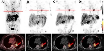 Maximum-intensity projections and transaxial slices of 68Ga-PP-F11N PET/CT (A) and posttherapeutic, quantitative SPECT/CT 72 h after the 1st (B), 2nd (C) and 3rd (D) RLT cycle of 177Lu-PP-F11N, showing metastatic tracer uptake, increasing with the number of RLT cycles. Two weeks prior the 3rd RLT cycle, the patient received additionally 10 mg everolimus daily, resulting in a further increase of tumor uptake. Red arrows indicate a mediastinal tumor lesion. Adapted from Rottenburger et al., 2025. J Nucl Med.