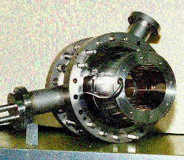 After extracting the low-energy muons from the moderator region they are separated from the fast muons by a 90 degree deflection. After passing the mirror they are focused to the sample region. This is done by an electrostatic transport system consisting of the acceleration unit with the moderator, an electrostatic mirror, three 'Einzel-lenses', and a conical shaped lens in front of the sample . The picture below shows an 'Einzel-lens' used in our experiment. The first and the third lens are cooled with liquid nitrogen in order to reduce exposure of thermal radiation to the moderator and the sample (the sample can be mounted on a cryostat which is not shown here).