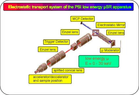 The first lens focuses the low-energy muons onto the electrostatic mirror which deflects them by 90 degree. The fast muons with energies above a few tens of keV are only slightly influenced by the mirror and are monitored by a MCP detector. The second lens creates an intermediate focus at the position of the trigger detector which gives the start signal for µSR measurements. The last 'Einzel-lens' focuses the low-energy muon beam to the sample region, where the conical shaped lens defines the final focus to reduce the beam spot size to 10 mm FWHM. The sample is mounted electrically insulated and can be set to a high voltage of up to +-12 kV in order to accelerate or decelerate the low-energy muon beam before implantation.