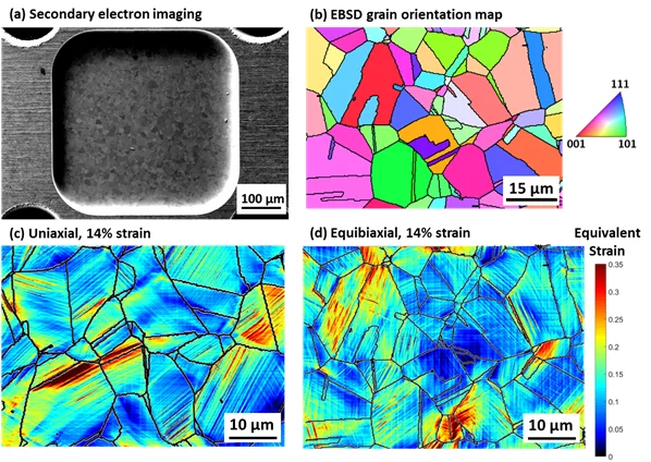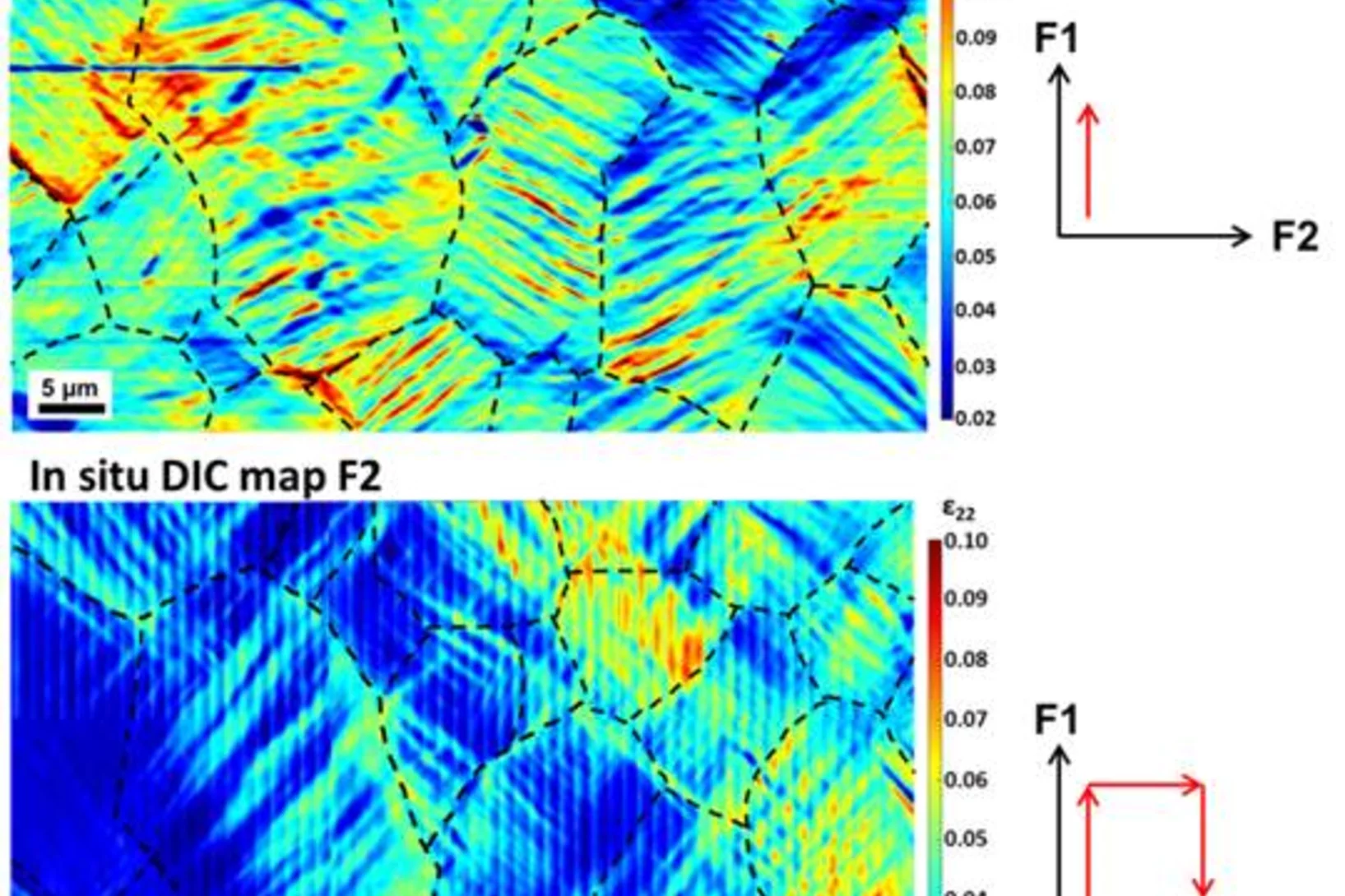 Researchers at PSI have established a link between the martensitic transformation, microstructural evolution and the mechanical behavior under multiaxial deformation in a NiTi alloy by using a unique combination of in situ high-resolution Digital Image Correlation (DIC), in situ X-ray diffraction and electron microscopy characterization.