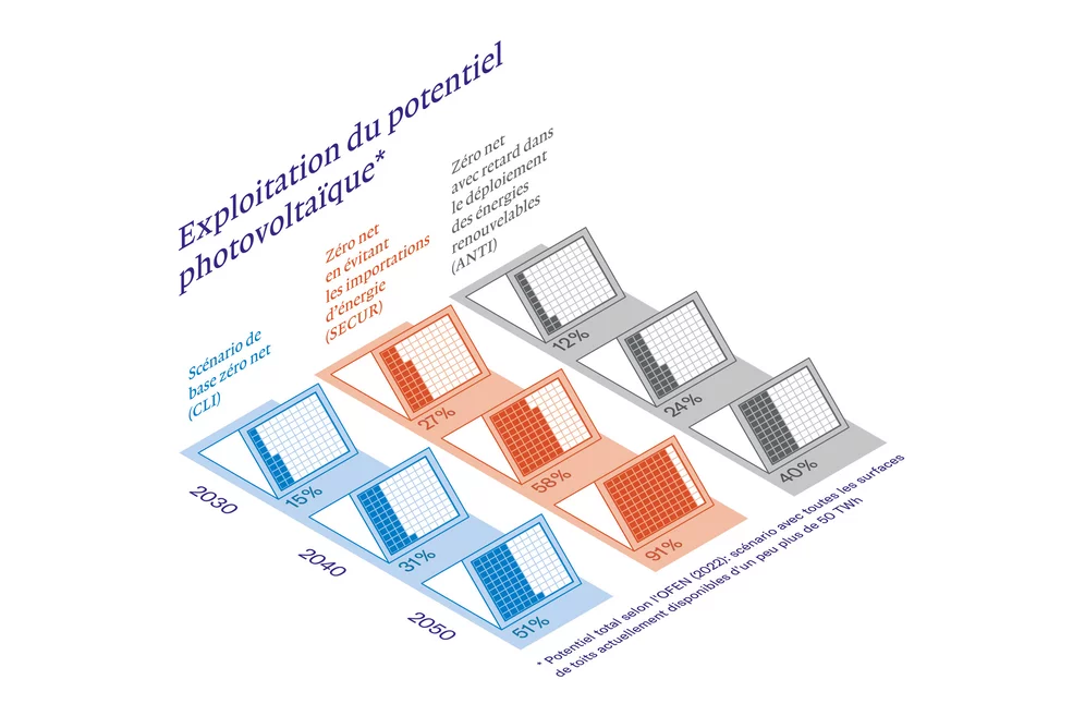 Les installations photovoltaïques jouent un rôle central dans la transition énergétique. La Suisse pourrait générer chaque année quelque 50 térawattheures de courant solaire, si toutes les surfaces disponibles étaient utilisées. Mais aujourd’hui, seules 4 % d’entre elles sont employées à cette fin. Si notre pays souhaite renoncer, en 2050 et dans une large mesure, aux importations d’énergie, il faudrait que plus de 90 % de ces surfaces soient utilisées. Pour atteindre les objectifs du scénario de base, il suffirait cependant d’employer environ 50 % des surfaces potentielles pour l’énergie solaire. Dans le scénario avec un déploiement retardé, ce taux serait d’environ 40 %.