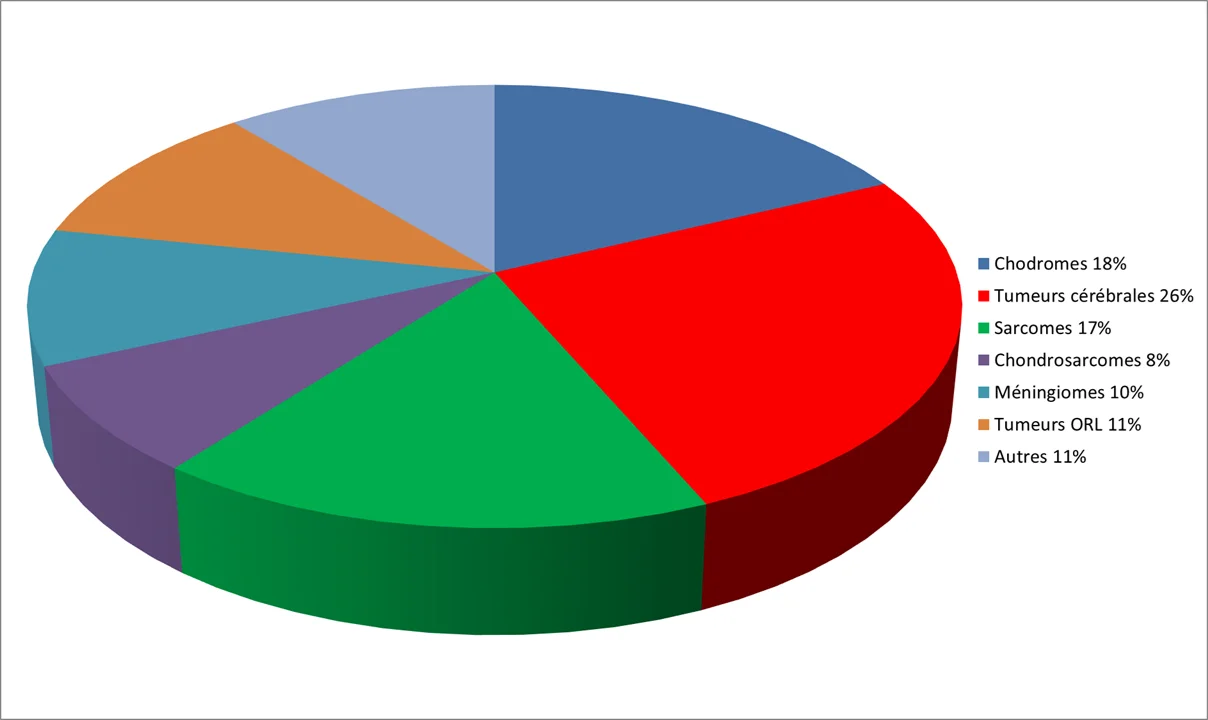 Ces tumeurs se développent dans l’os et/ou dans le tissu conjonctif, leur croissance est lente et elles métastasent rarement. Mais elles détruisent les structures voisines saines, qui sont sensibles et souvent vitales. Comme les faisceaux de protons s’arrêtent à une profondeur calculable et libèrent la plus importante quantité de radiation de manière contrôlable dans cette zone d’arrêt (le pic de Bragg), on irradie depuis de nombreuses années les chordomes et les chondrosarcomes de la base du crâne dans le cadre d’un programme cohérent et sérieux, surtout au Harvard Cyclotron / Massachusetts General Hospital à Boston. Comparé à l’irradiation avec des photons produits par des accélérateurs linéaires, le taux de contrôle local de la tumeur a pu être amélioré: il est passé d’environ 40% à 80% pour les chondrosarcomes, et de 5% à plus de 50% pour les chordomes.