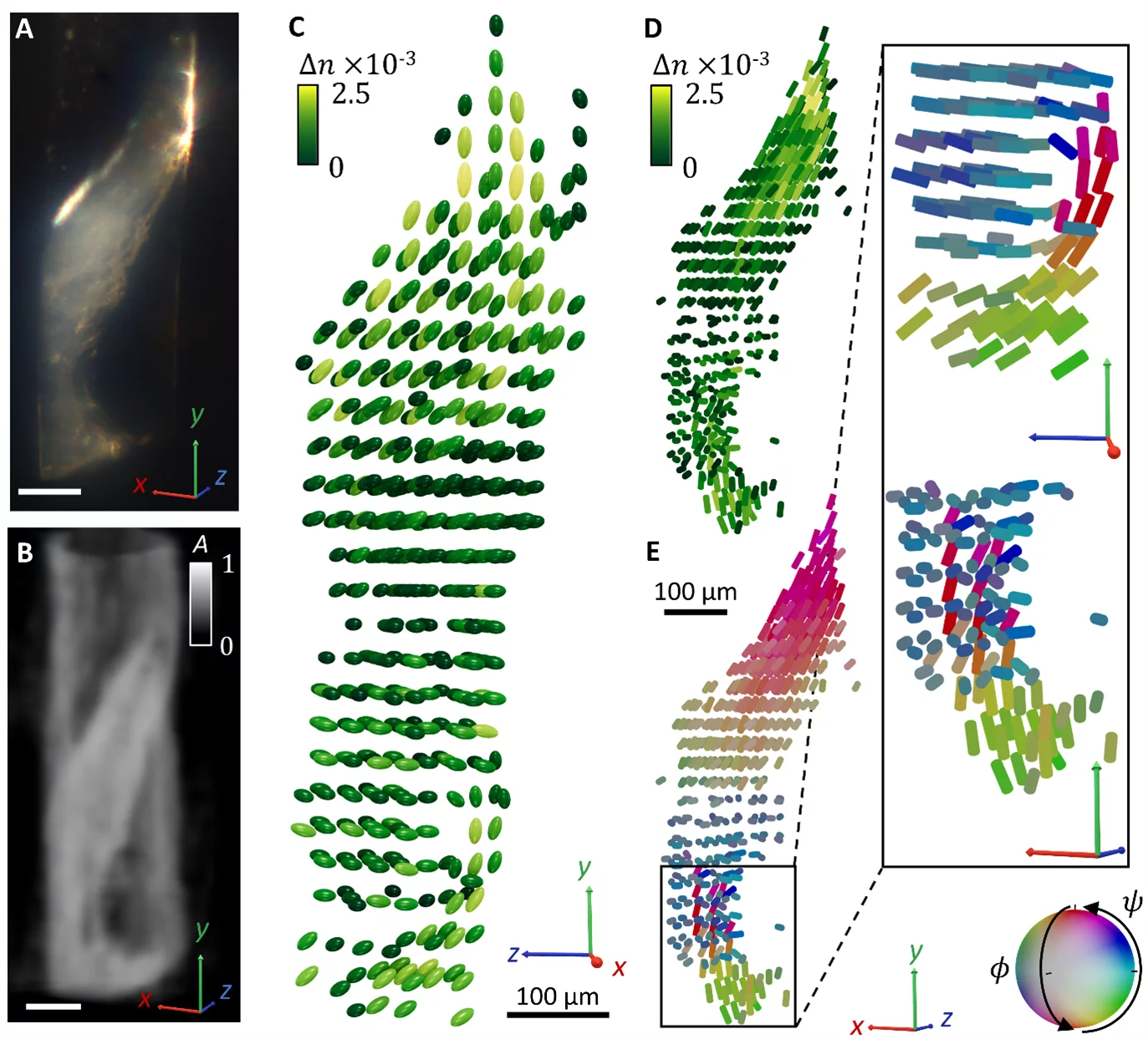 This home-built free space setup aims at measuring the polarizance of the sample in 3D. To do so, it performs multiple Mueller polarimetric acquisition (see setup Mueller Polarimetric Microscope) at different view of the sample in a tomographic fashion, i.e. at different tilts and rotation of the sample. Due to the use of visible light, the sample need to be thin enough to be always in focus and is therefore often milled into a small cylinder shape (~200 um). To remove unwanted edge scattering and lens effect, the sample is immersed in matching index liquid. Using a gradient based iterative algorithm, one can retrieve from those measurements the 3D birefringence properties of the sample, in its full volume. See https://doi.org/10.1002/advs.202502075