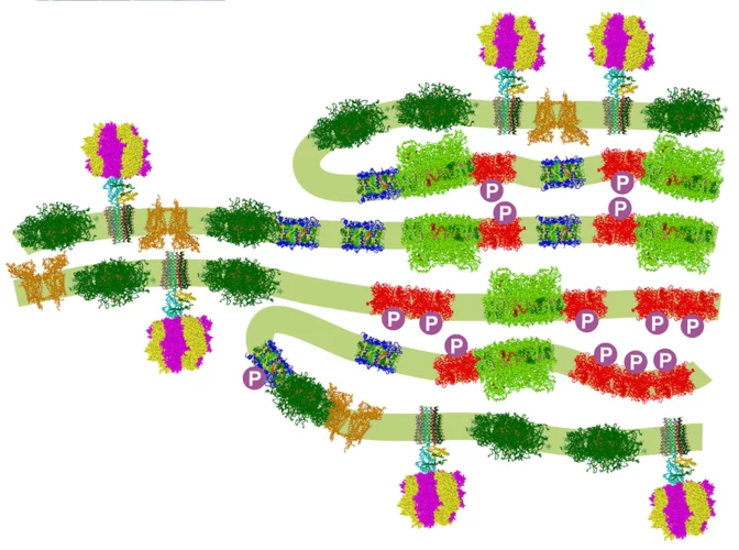In oxygenic photosynthesis photochemical reactions occur in two different photosystems (PSs) and the light-energy conversion is regulated by balancing their activity. Such a power balance requires a sophisticated regulatory mechanism called state transitions, which involve reversible phosphorylation of the light-harvesting complex proteins (LHCIIs) to redistribute absorbed excitation energy between the two photosystems.