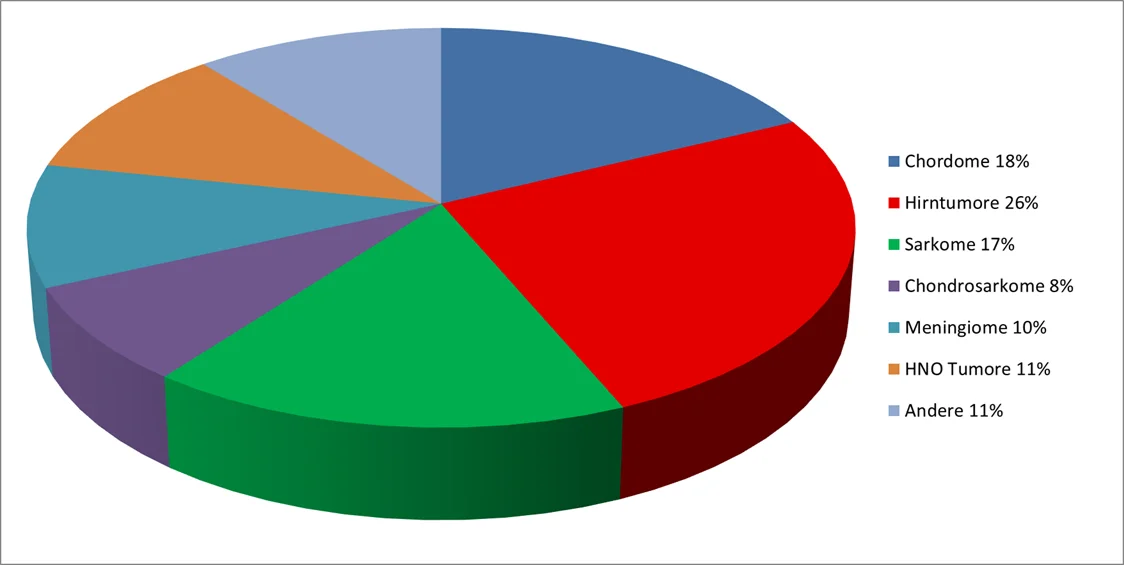 Über 680 Patientinnen und Patienten sind wegen eines Chondrosarkoms oder Chordoms im Bereich der Schädelbasis oder der Wirbelsäule seit 1996 am PSI mit Protonen bestrahlt worden. Zahlreiche Veröffentlichungen zu der über 25-jährigen Erfahrung in der Bestrahlung dieser sehr seltenen Tumoren sind erschienen (Walser et al. 2021, Beer et al. 2020, Tran et al. 2019, Weber et al. 2018, Snider et al. 2018, Stieb et al. 2017, Weber et al. 2016, Schneider et al. 2013, Pehlivan et al. 2012, Staab et al. 2011, Ares et al. 2009, Weber et al. 2005).