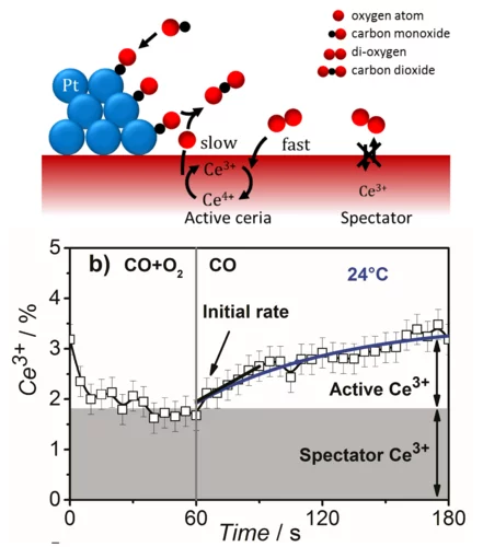 Using time-resolved resonant X-ray emission spectroscopy, we quantitatively correlated the initial rate of Ce3+ formation under transient conditions to the overall rate of CO oxidation under steady-state conditions and showed that ceria reduction is a kinetically relevant step in CO oxidation, whereas a fraction of Ce3+ was present as spectators.