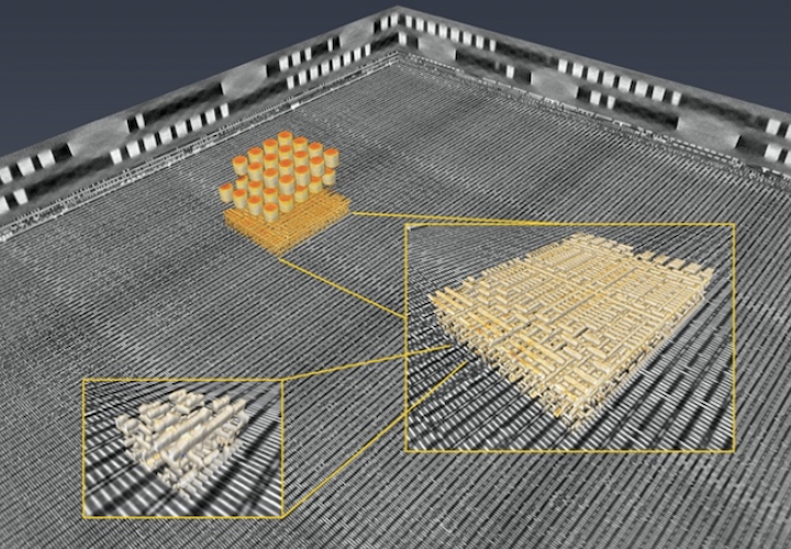 The ability to image integrated circuits across different length scales is important for tasks ranging from design validation to failure analysis and quality control. Currently a suite of distinct probes is needed, from optical microscopy for imaging the largest features to electron microscopy for the smallest ones. PSI researchers have now further developed a method pioneered at SLS, ptychographic X-ray laminography, and demonstrate that they can obtain non-destructive 3D views of an entire chip, and then zoom in on arbitrarily chosen subregions of interest to acquire high-resolution images. As a demonstration, they used the technique to first scan a 300 × 300 μm2 area of a 16-nm FinFET integrated circuit in low-resolution mode, to subsequently focus on a section of 40-μm diameter, of which they produced a 3D image with 18.9-nm reconstruction resolution.